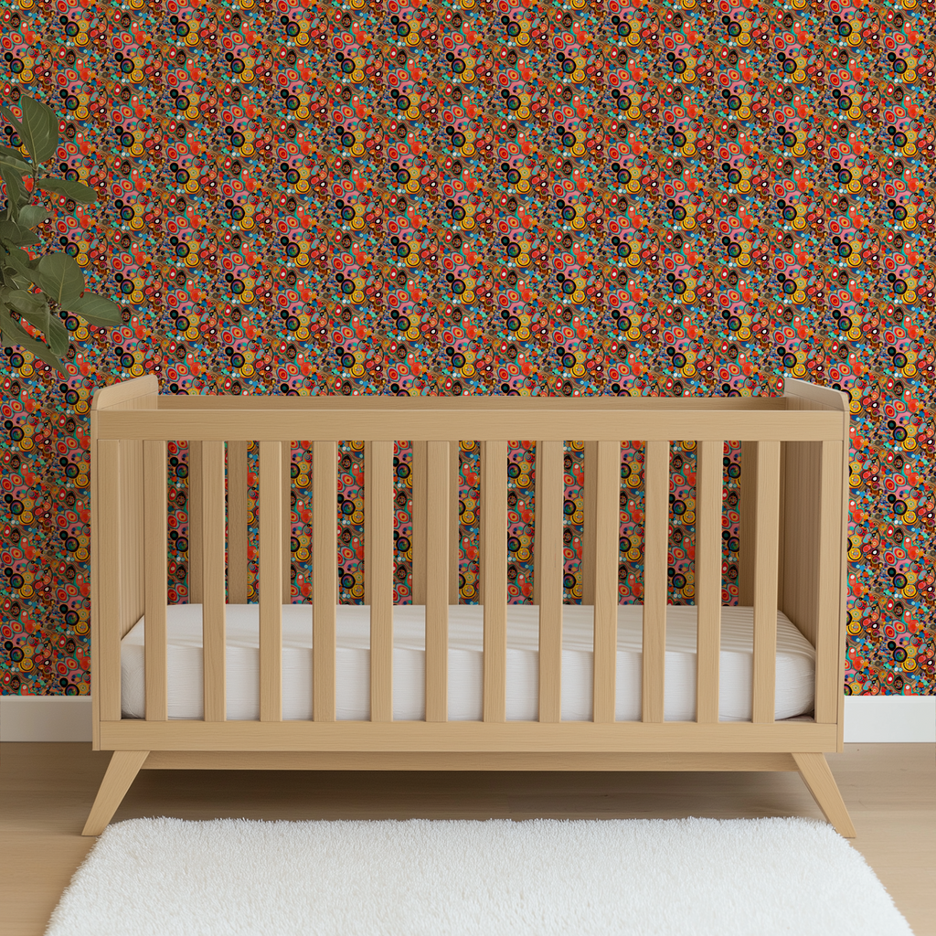 Vibrant abstract pattern featuring colorful concentric circles, organic shapes, and swirling designs in bold reds, oranges, yellows, and blues—perfect for a standout space.