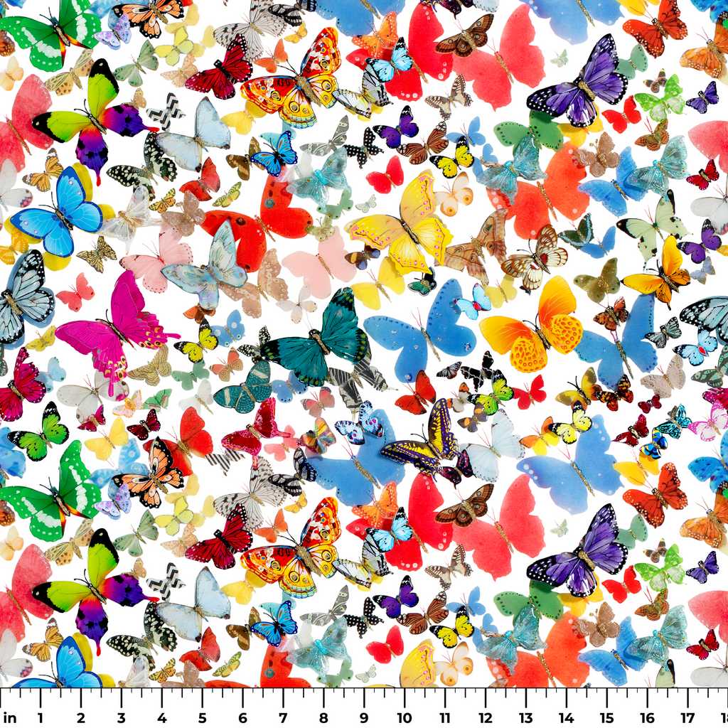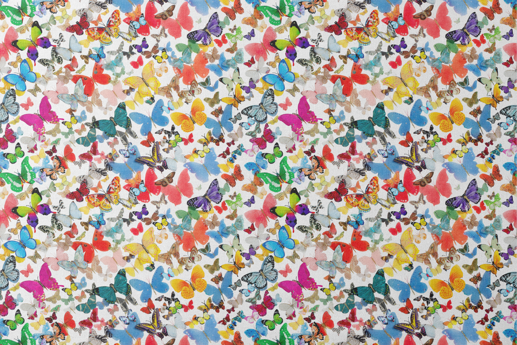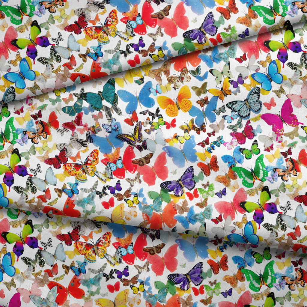 A vibrant collage of colorful butterflies in every shade imaginable, from vivid blues and purples to bright reds, yellows, and greens, creating a kaleidoscopic nature-inspired pattern. Ideal for unique home decor and cute crafts.