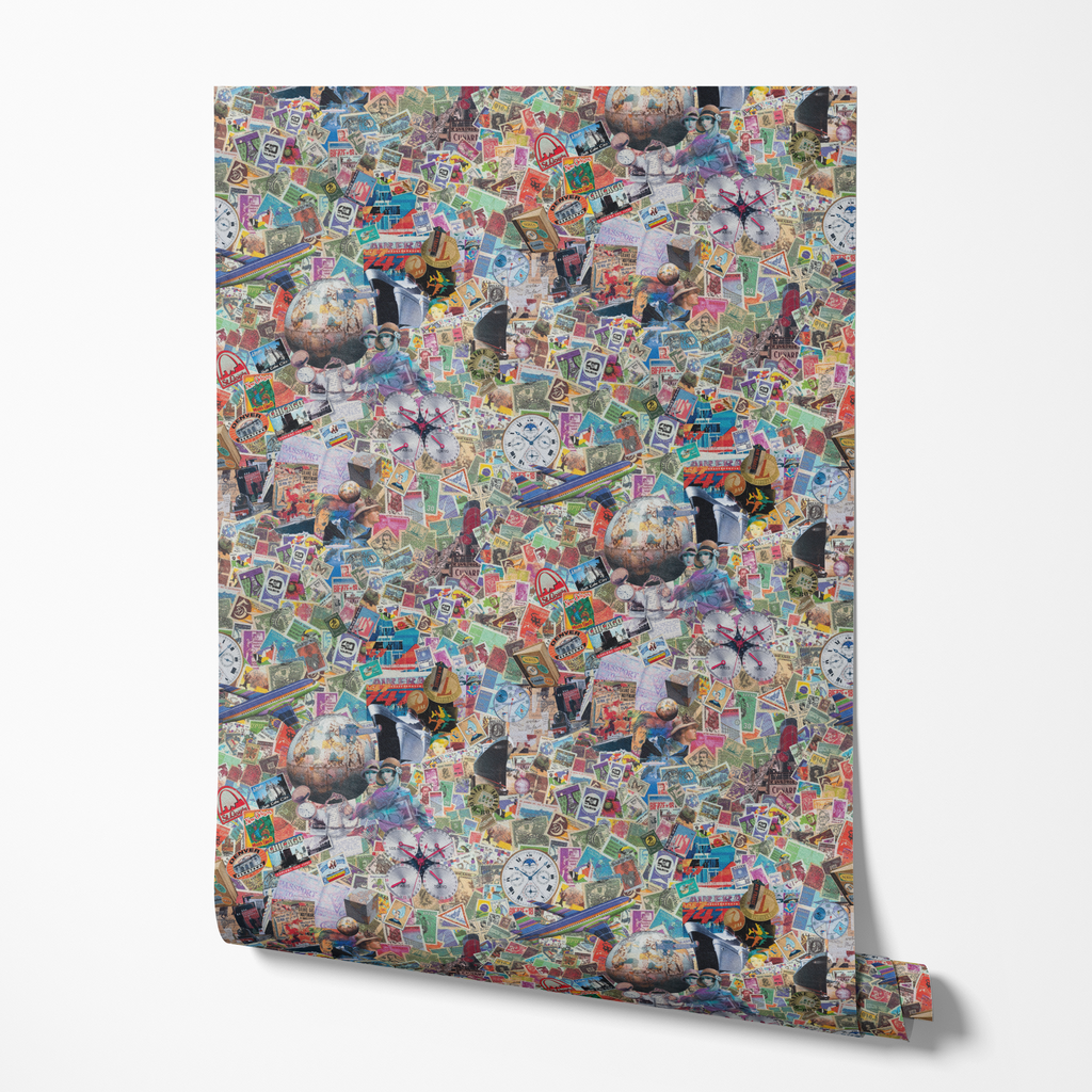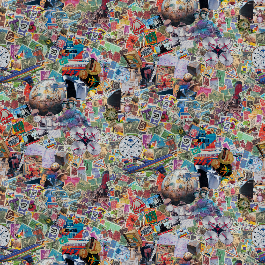 Robert Swedroe's vibrant collage featuring an eclectic mix of colorful stamps, postcards, compasses, and travel vehicles. Perfect for a travel-themed space or if you're seeking a whimsical, retro aesthetic for any room.