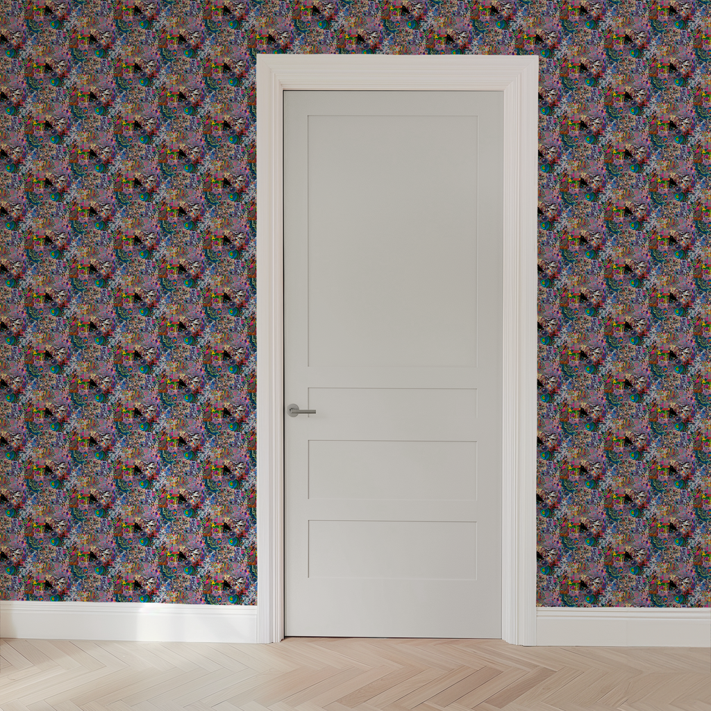 Trippy psychedelic abstract art featuring swirling patterns, vibrant colors, and a kaleidoscope of geometric shapes. Perfect for a modern statement wall in any room.
