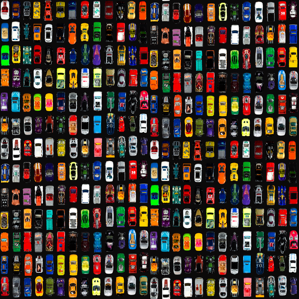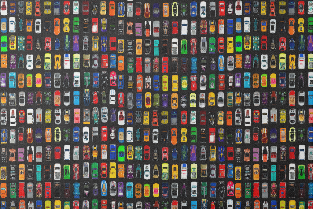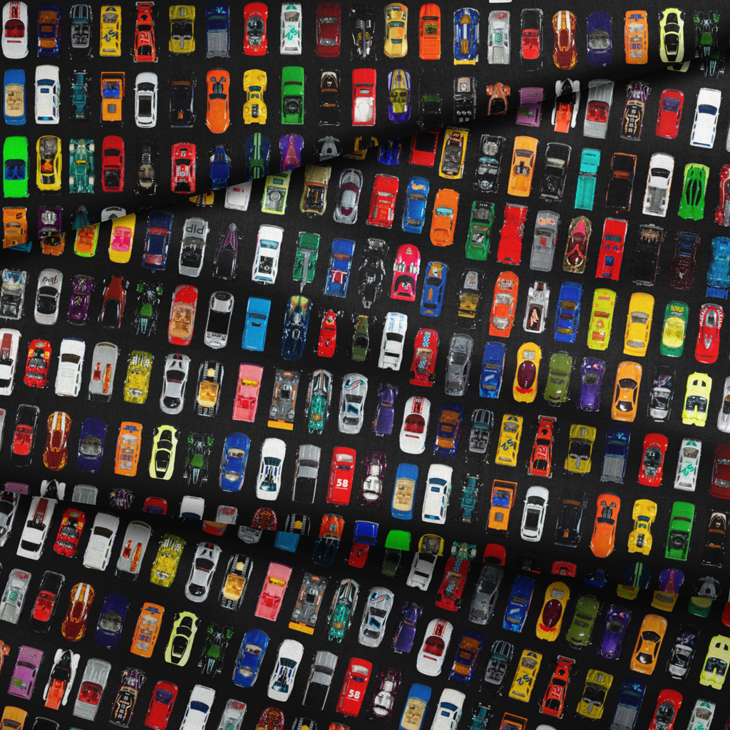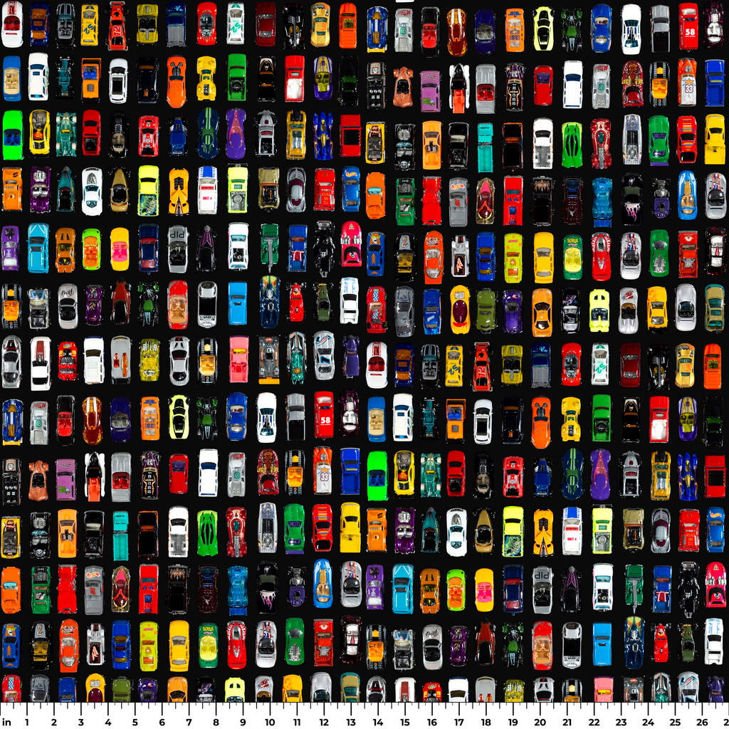 A vibrant collection of colorful cars arranged in a grid pattern, featuring racing, sports, and vintage models. Perfect DIY touch for automotive enthusiasts and those who love bold vibes.