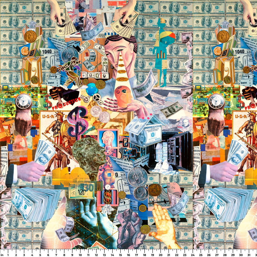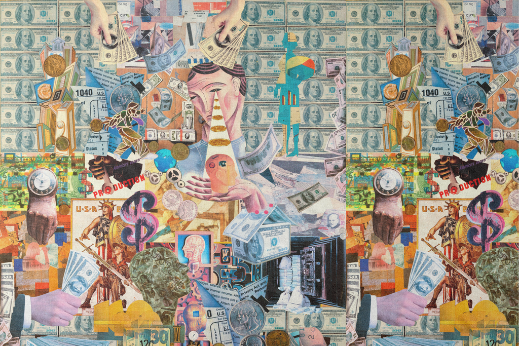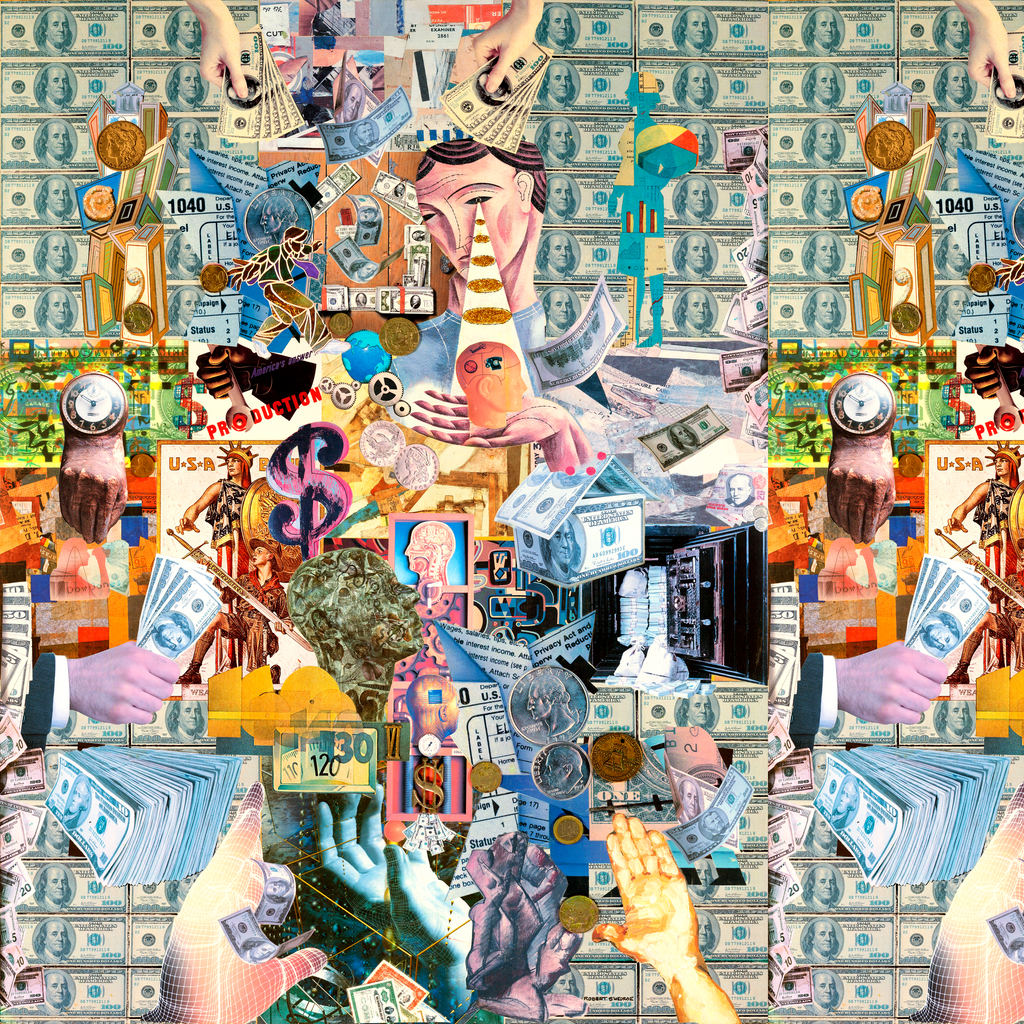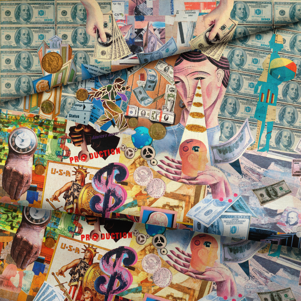 Robert Swedroe's vibrant collage artwork features money motifs, dollar bills, and various currency elements. The contemporary design combines bold imagery in a chaotic, eye-catching arrangement with rich greens and subtle textures. Perfect for an eclectic touch to any project.