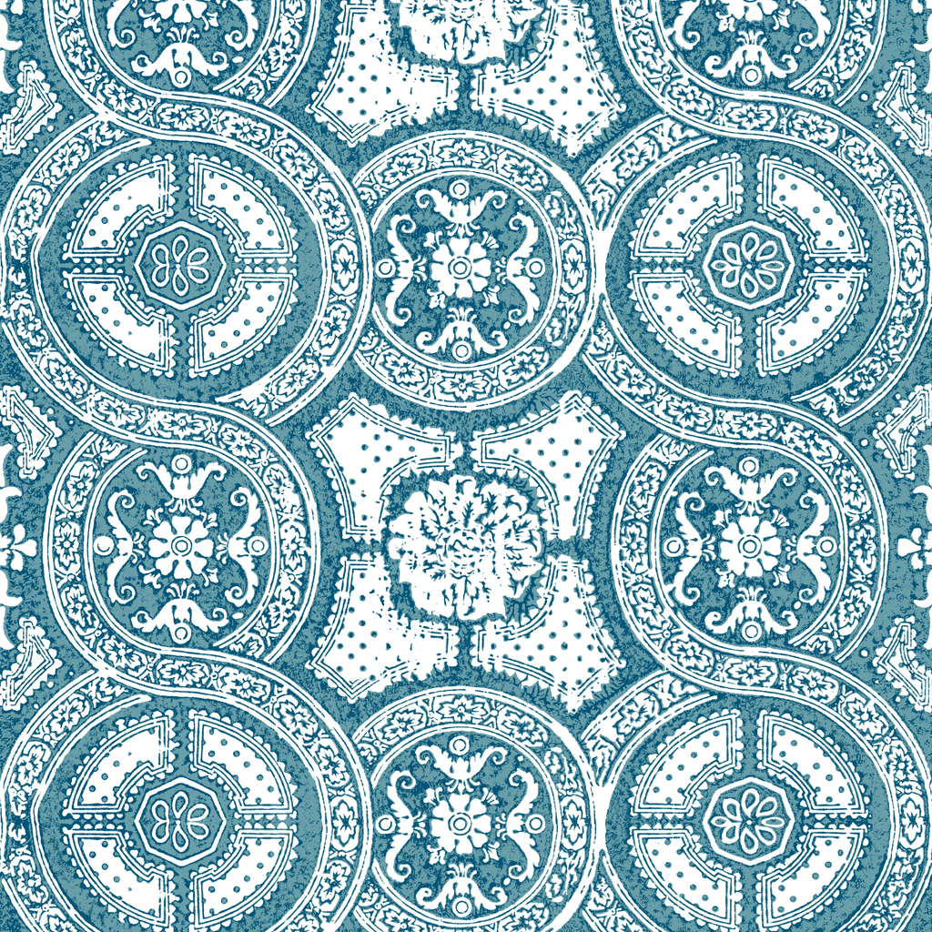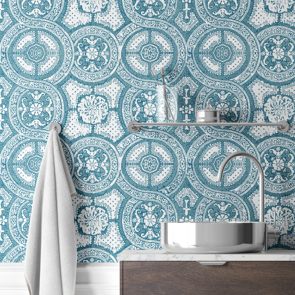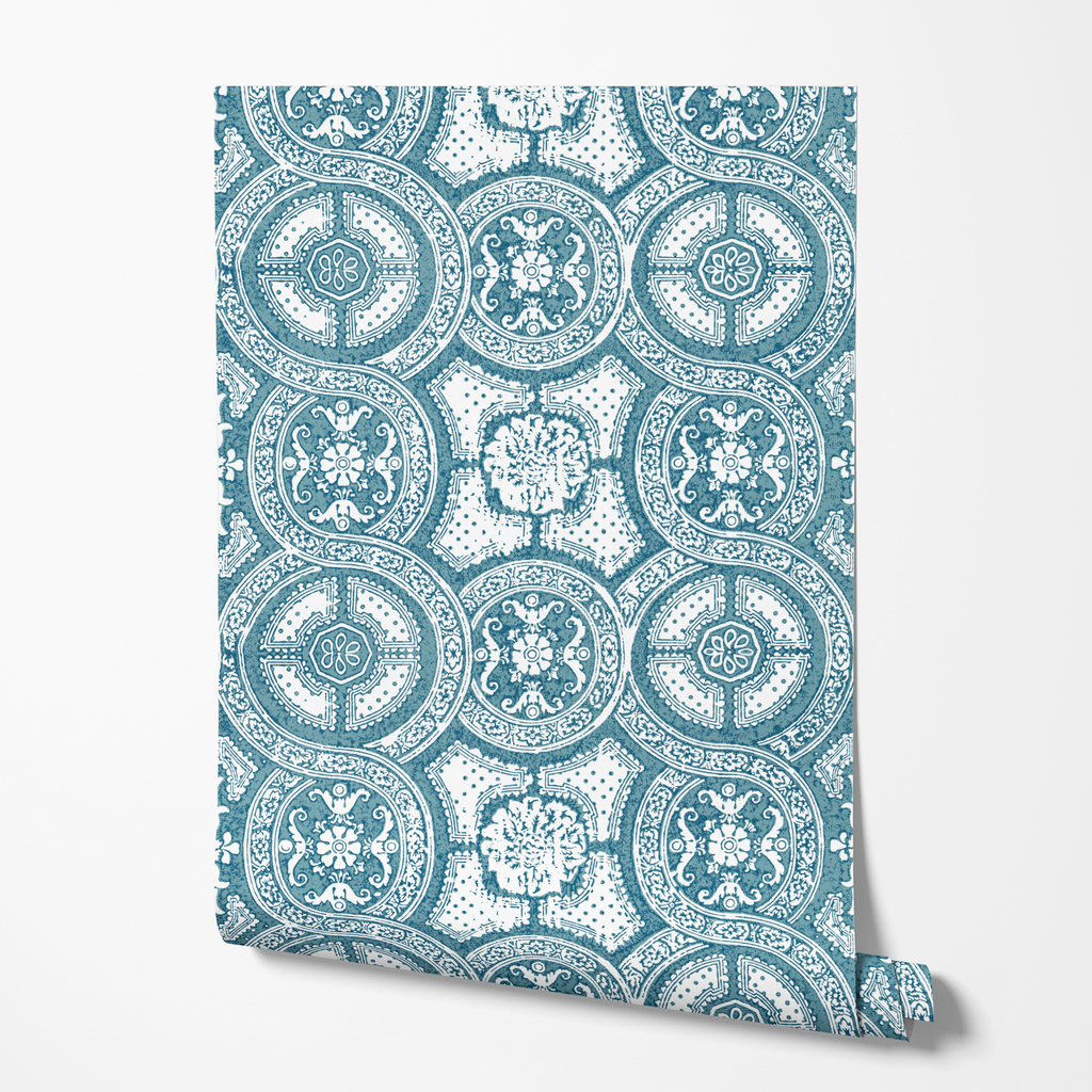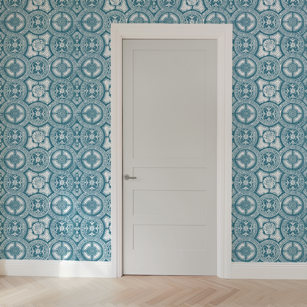Elegant teal medallion pattern featuring intricate traditional motifs in a seamless geometric arrangement. Perfect for home decor with its classic damask-inspired design and sophisticated color palette.