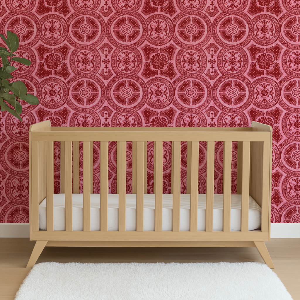 Elegant traditional pattern featuring intricate medallions and damask motifs in rich burgundy and pink tones. Perfect for home decor or quilting projects with its classic heritage design.