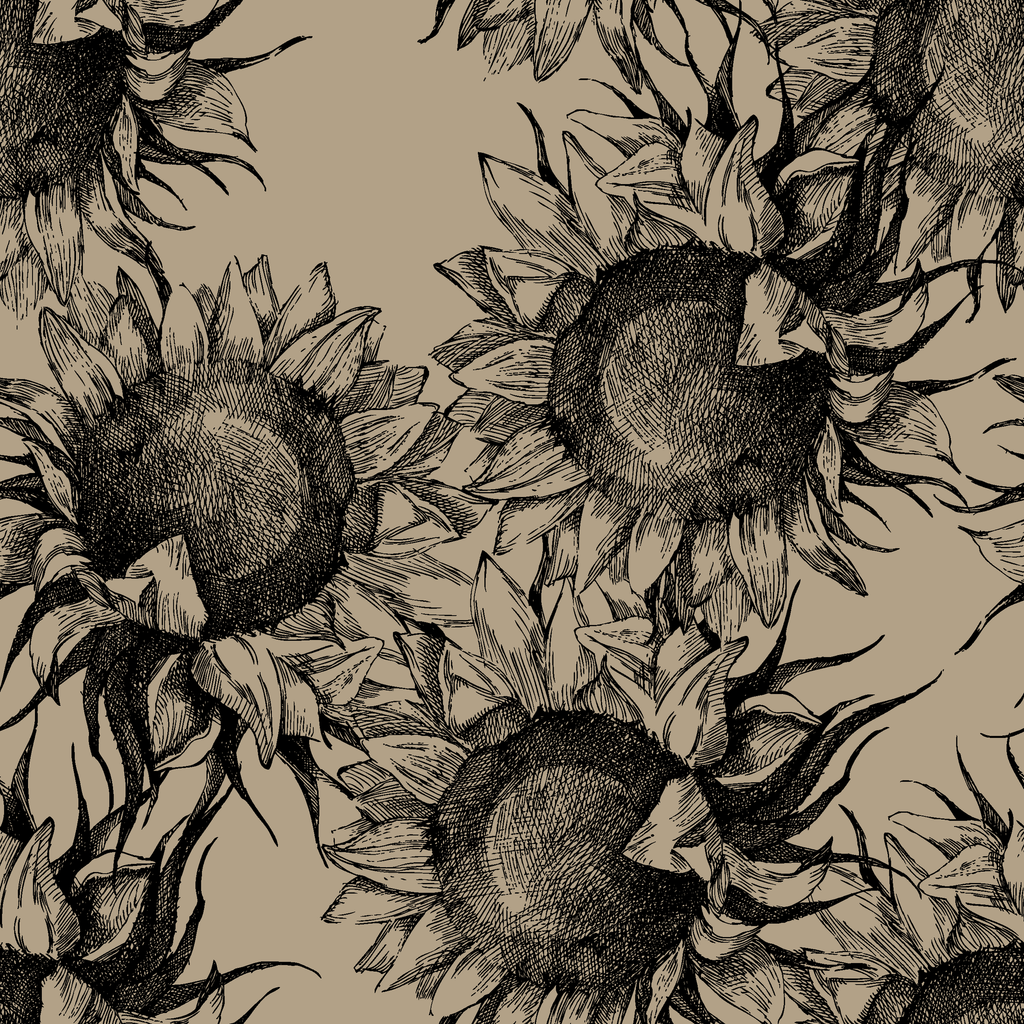 Country farmhouse sunflower illustration in vintage black on brown sketchbook style, featuring dramatic blooms with detailed petals and seeds perfect for botanical art lovers.