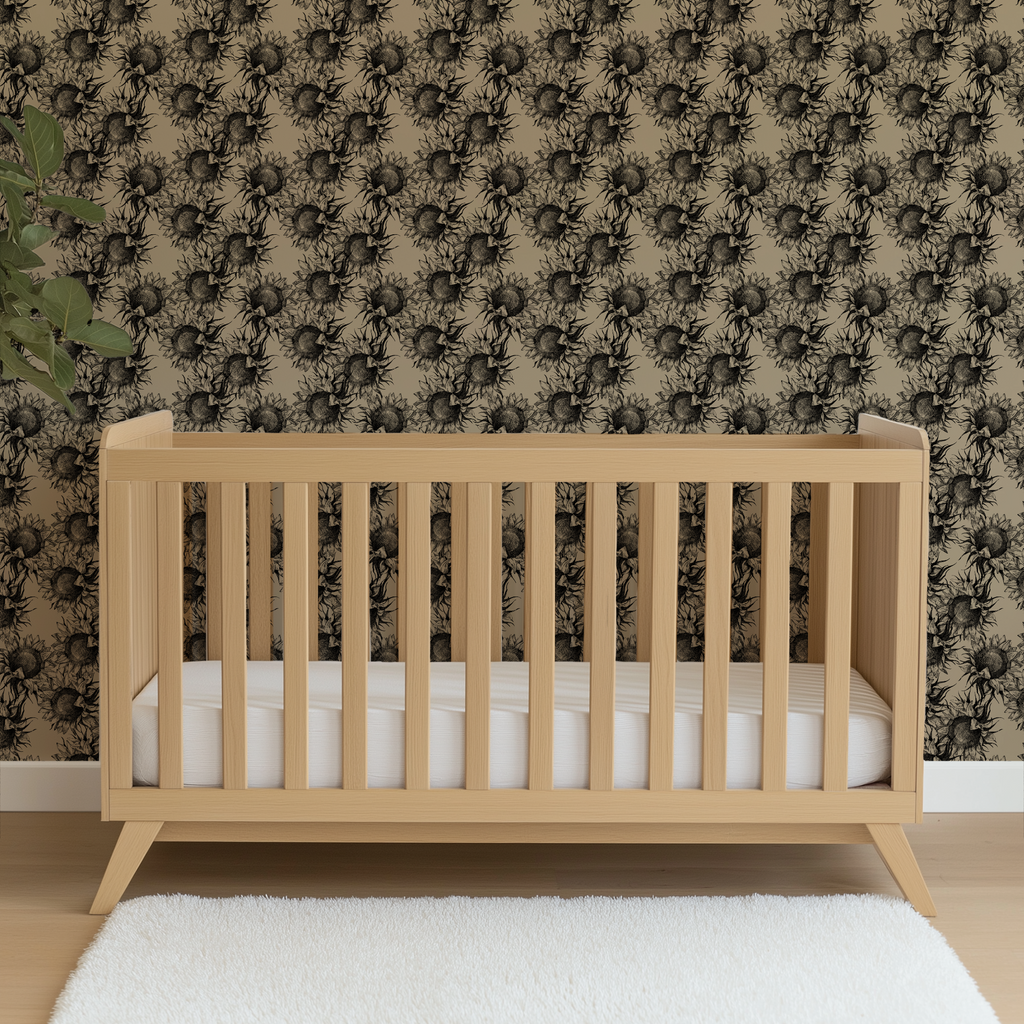 Rustic Sunflower Sketch Black on Brown Wallpaper