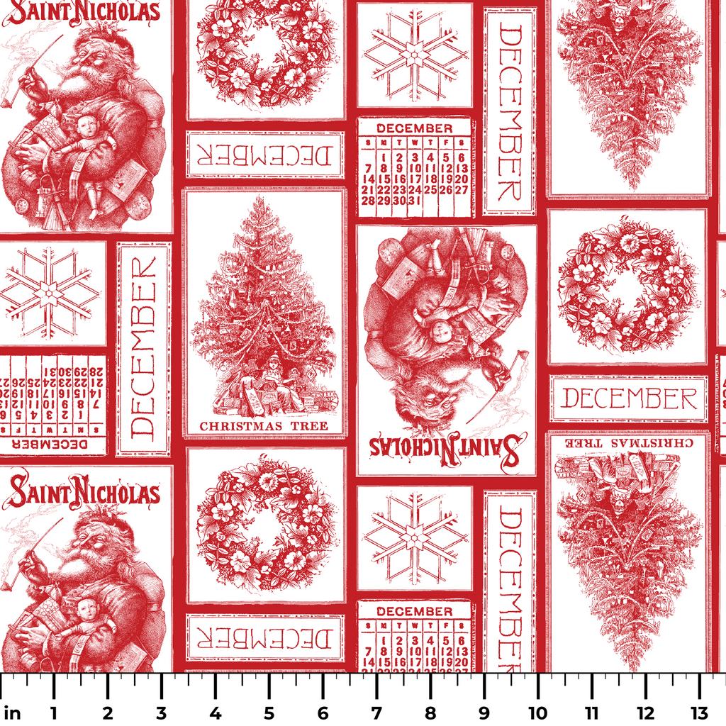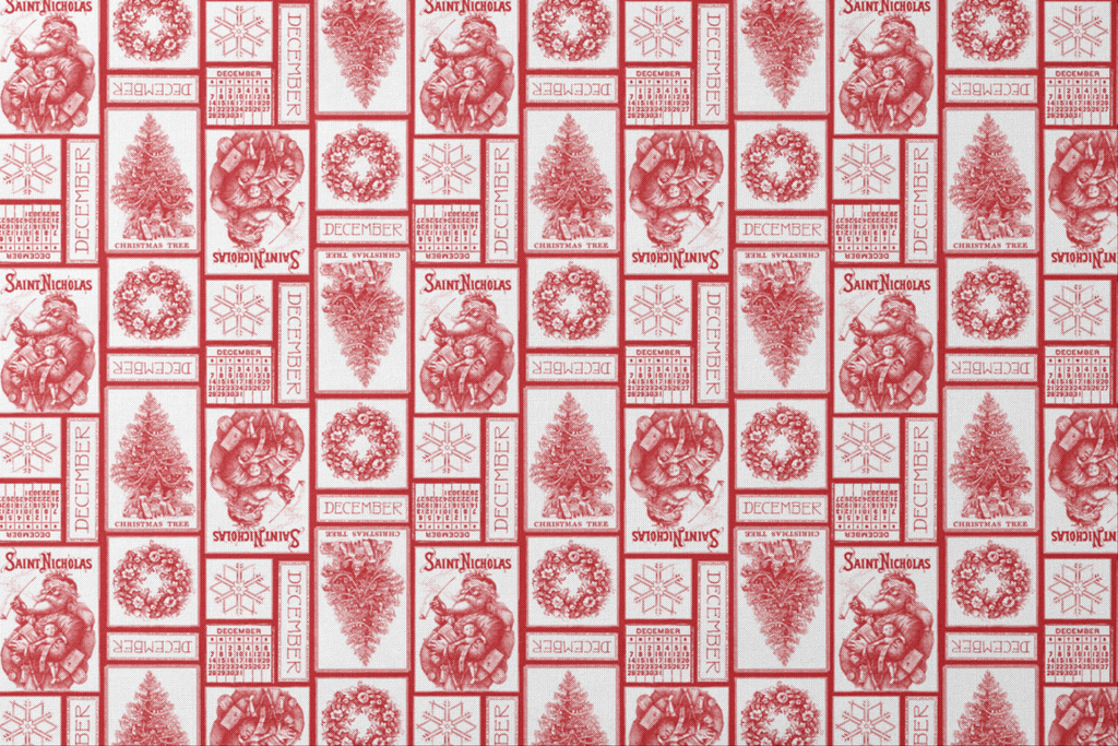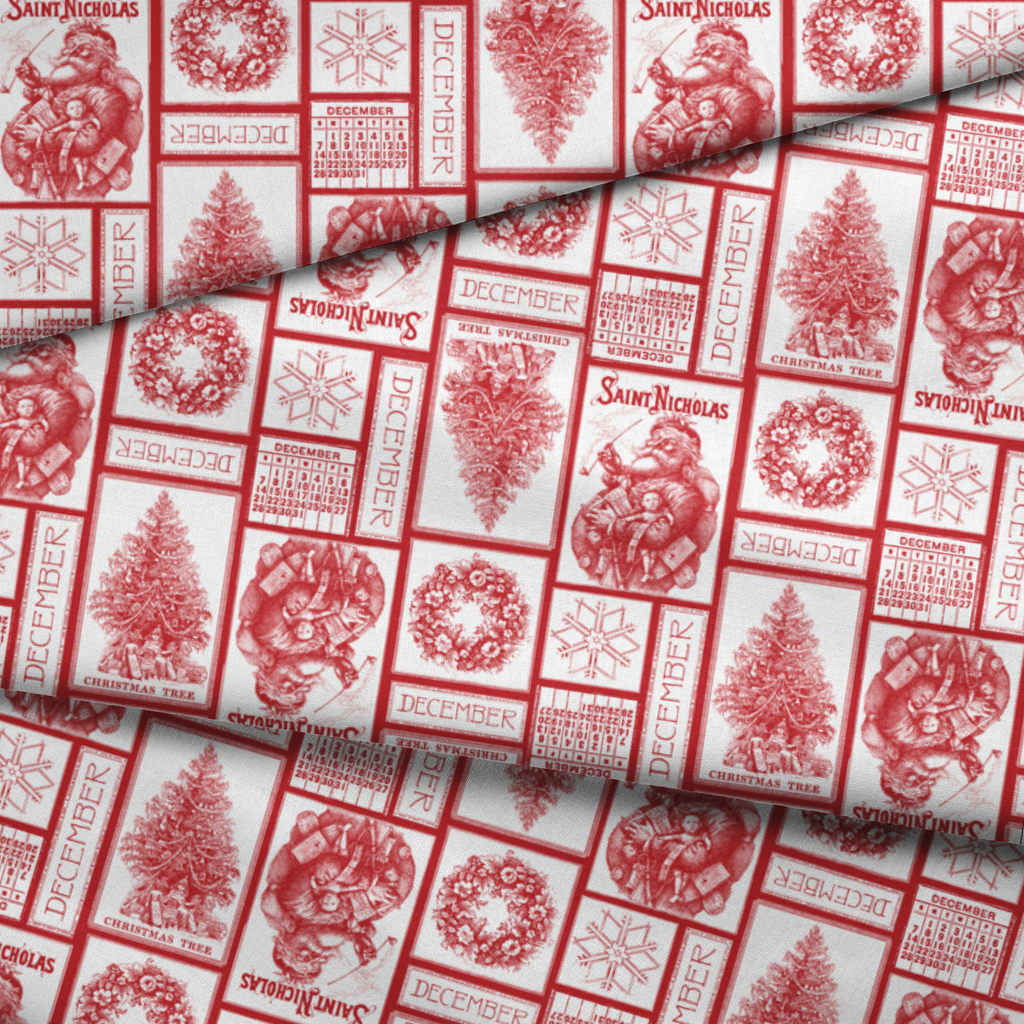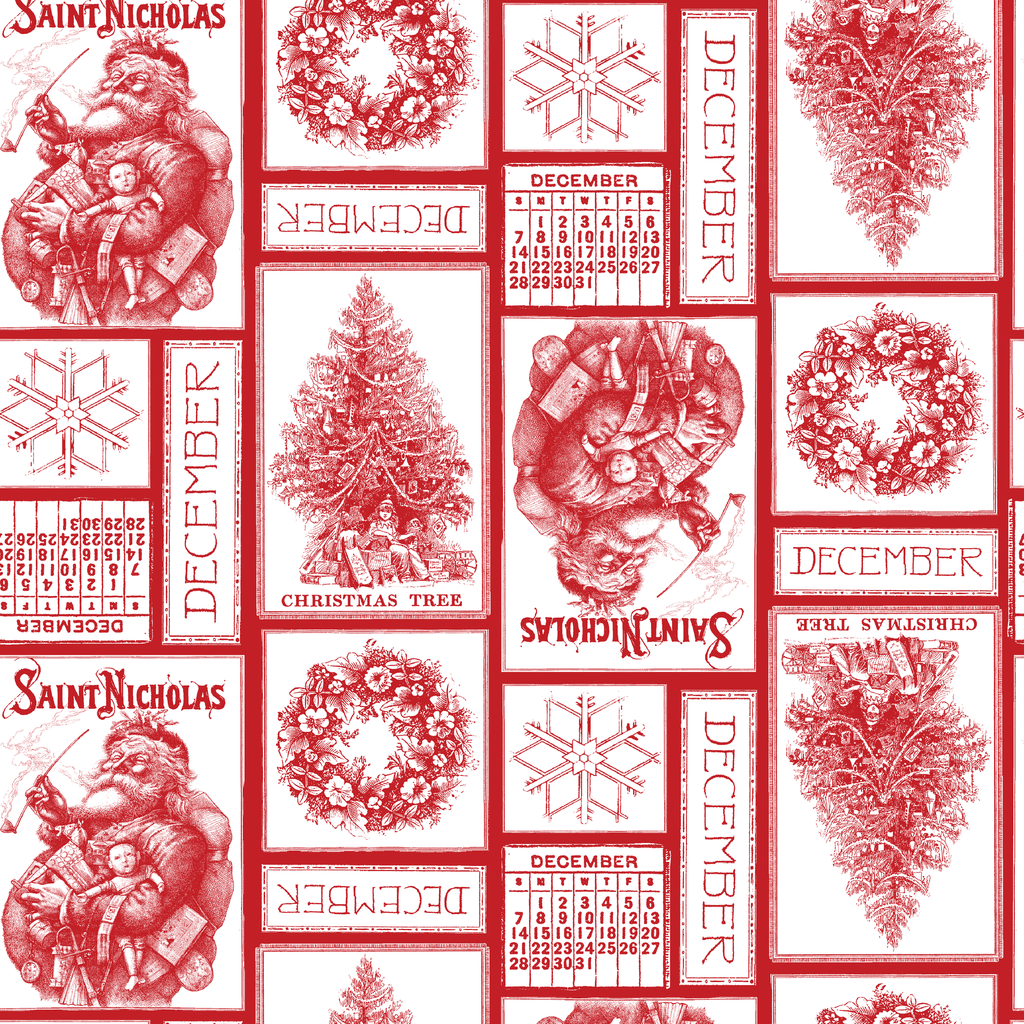This vintage Christmas collage features holiday motifs in deep red tones, including Saint Nicholas, wreaths, snowflakes, and a decorated tree. Perfect for traditional seasonal decor and holiday crafting projects.
