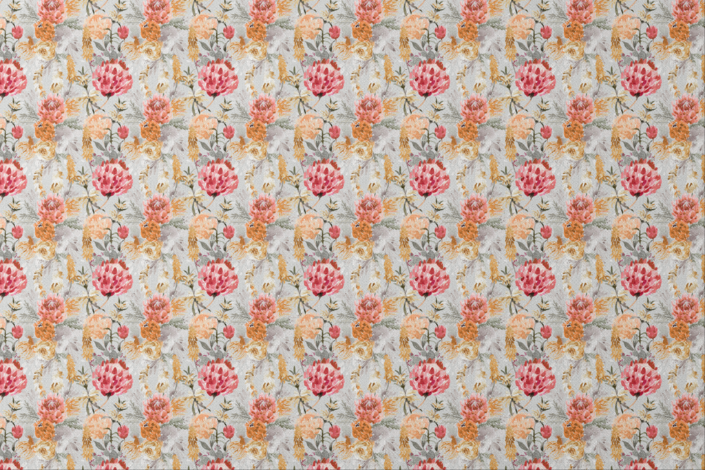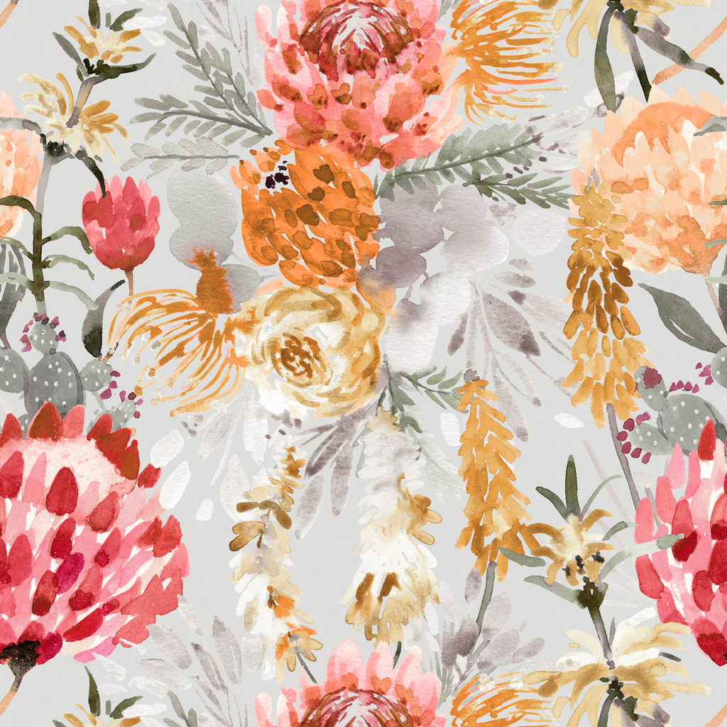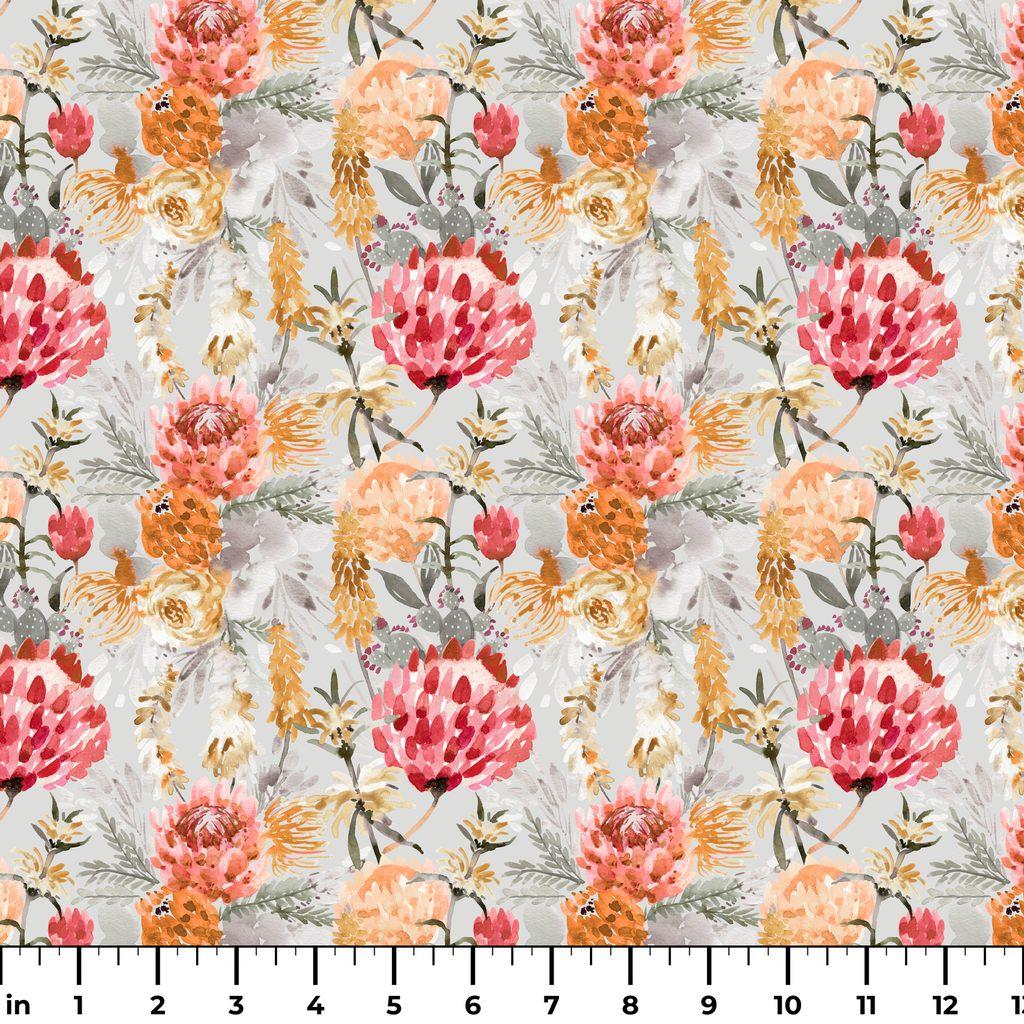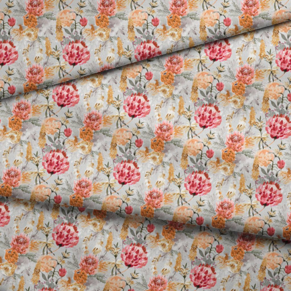 Dreamy watercolor desert blooms dance across a soft gray background in this stunning botanical print. Pink protea flowers mingle with golden wheat-like stems, silvery foliage, and delicate cactus accents, creating a warm yet sophisticated palette of coral, amber, and sage. This statement fabric would transform a simple throw pillow into a conversation piece or bring a touch of artistic flair to a custom tote bag or table runner.