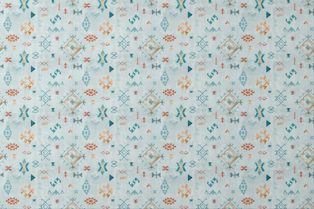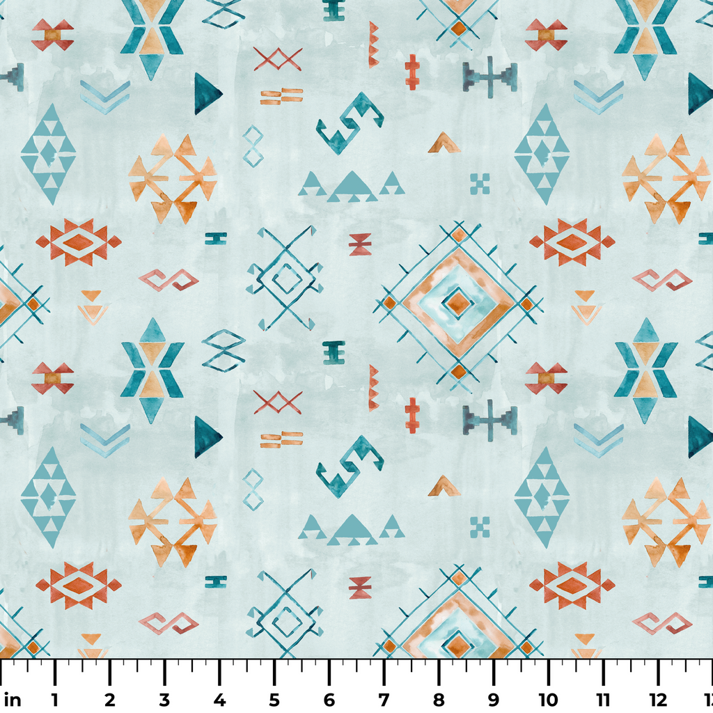 Scattered across a misty blue background, this enchanting tribal-inspired pattern features watercolor geometric symbols in shades of teal, rust, and terracotta. The handcrafted quality of each symbol—from diamond motifs to crossed lines and triangular formations—creates a contemporary take on ancient designs with a soft, artistic touch. Perfect for bohemian throw pillows or a statement wall in a modern nursery, this fabric brings an earthy sophistication to any crafting project.