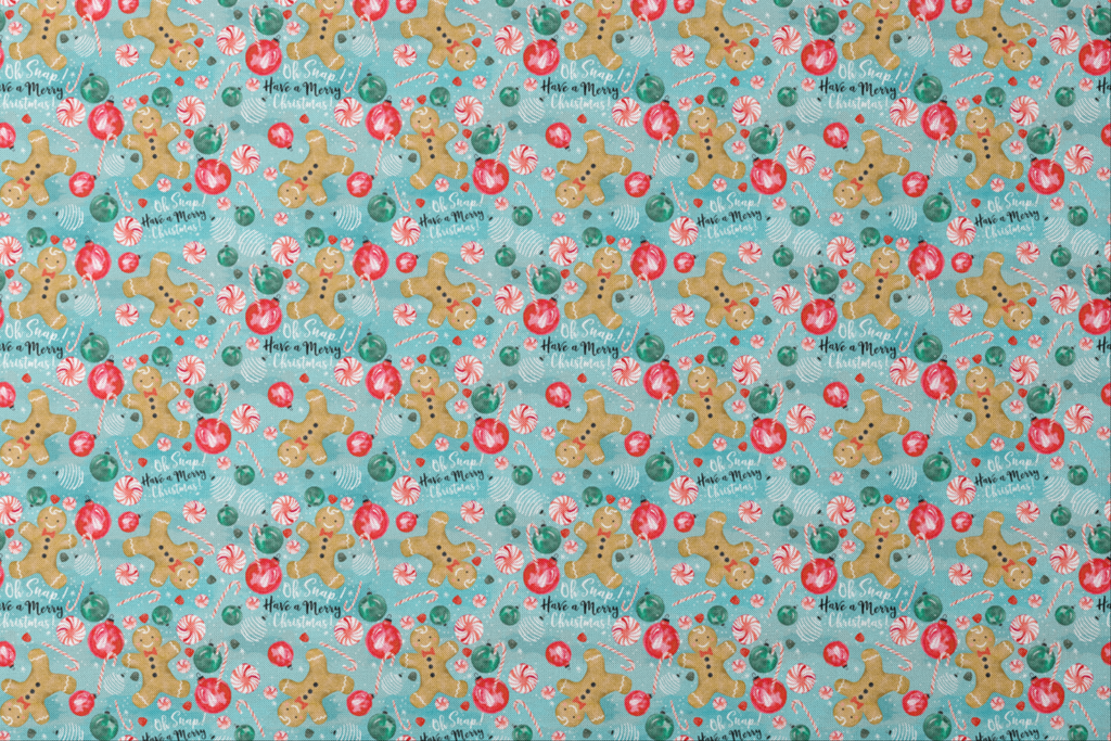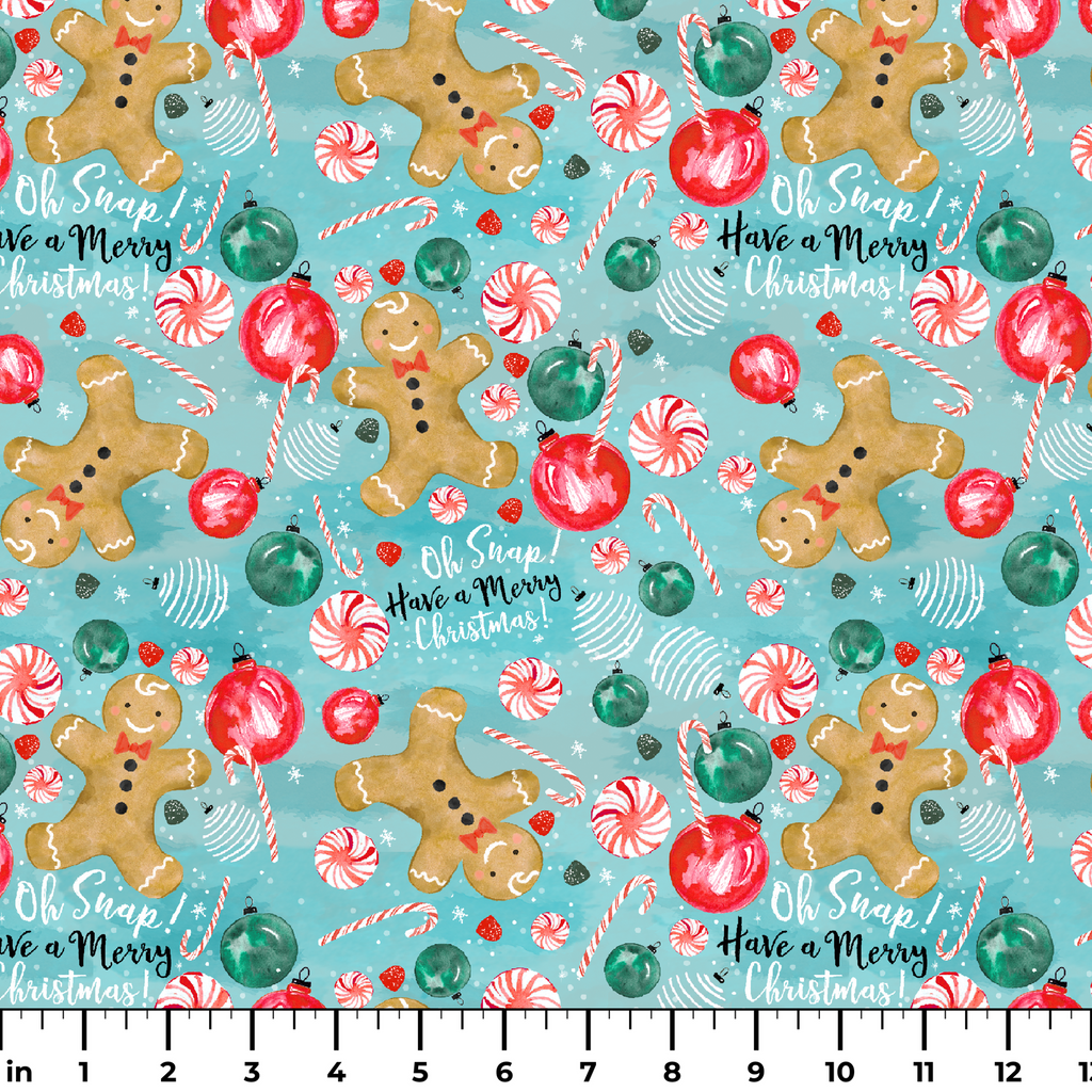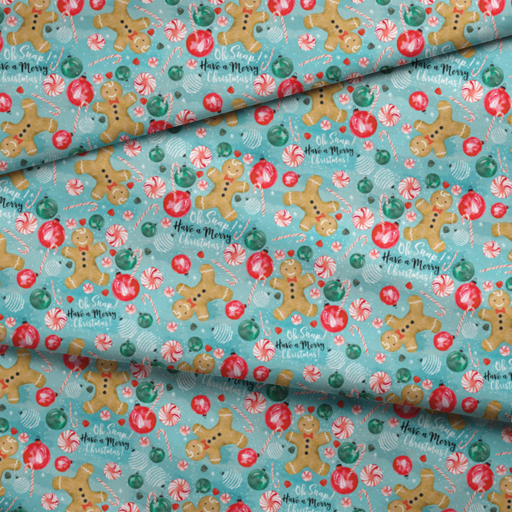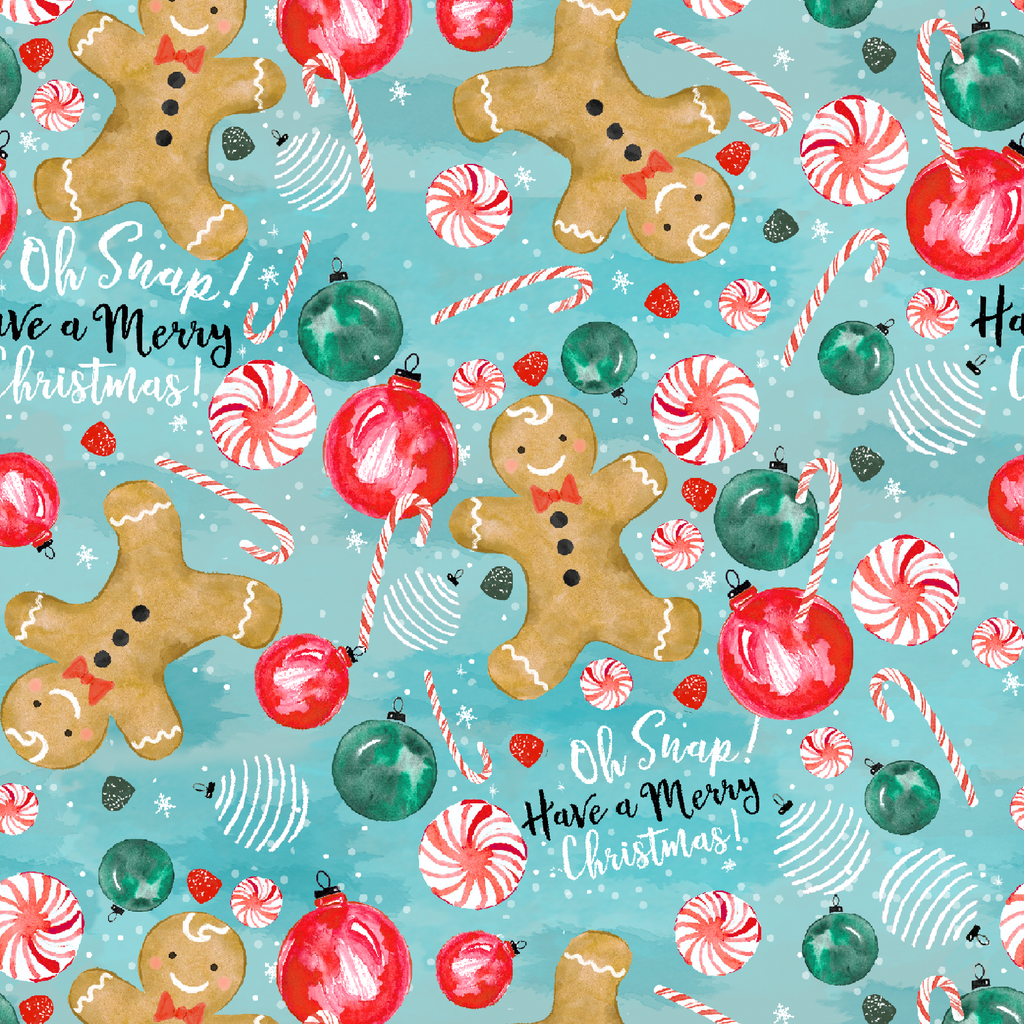 Cheerful gingerbread friends dance across a frosty blue background alongside festive ornaments in red and green, peppermint swirls, and candy canes. The watercolor-style illustration captures holiday magic with its whimsical "Oh Snap! Have a Merry Christmas!" text scattered throughout the design. This playful pattern would be perfect for holiday table runners or a festive apron that brings joy to your kitchen during the season.