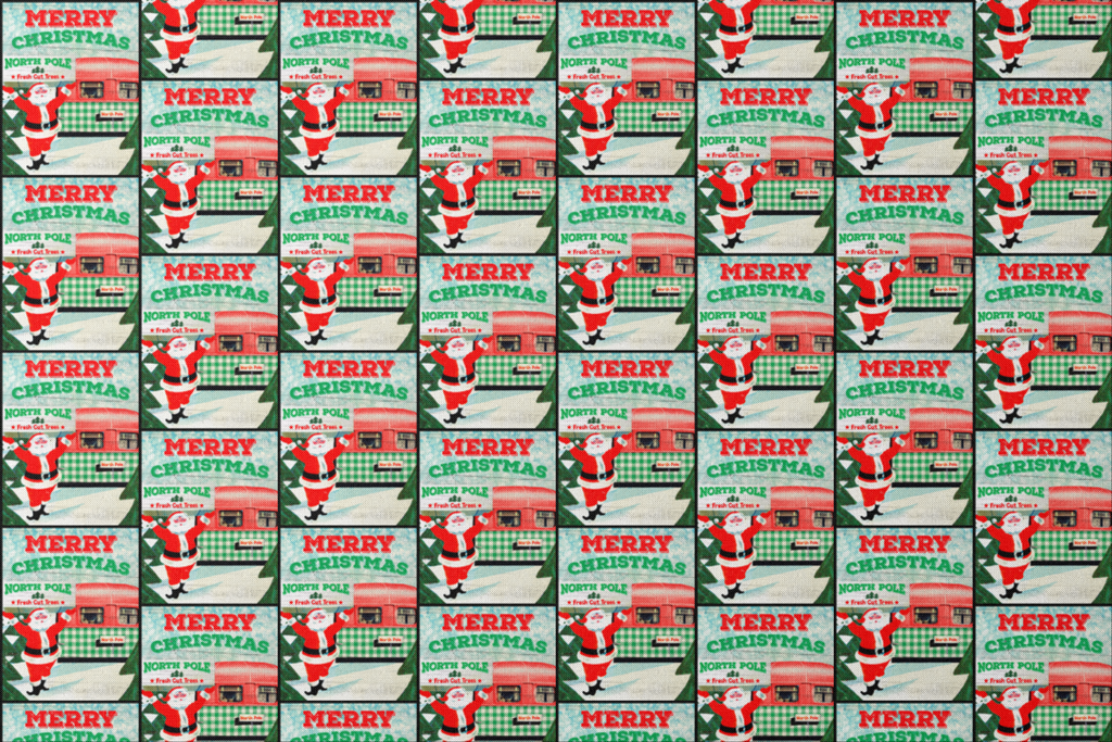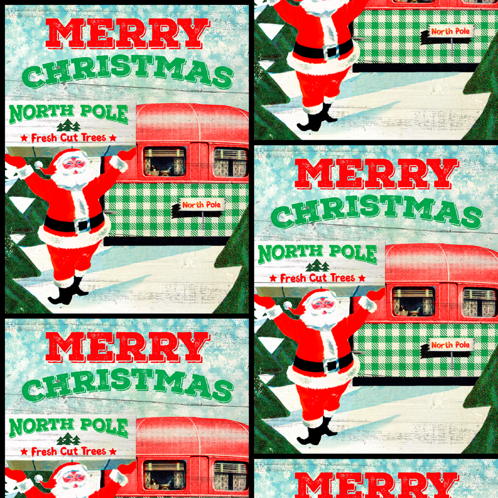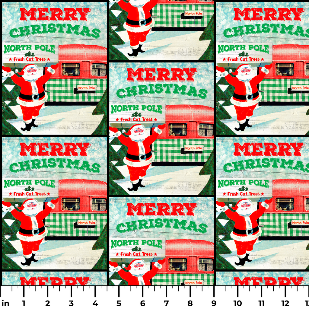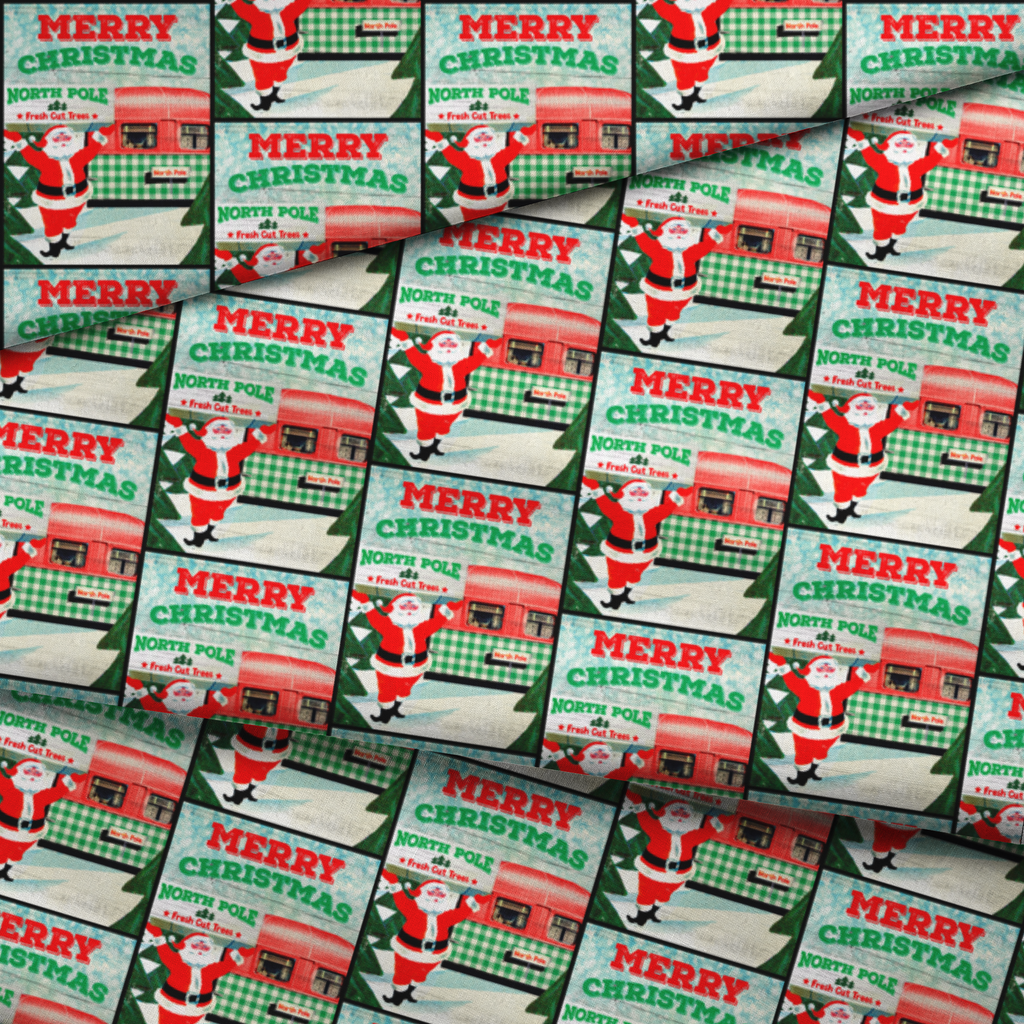This nostalgic Christmas fabric features a cheerful North Pole scene with a vintage holiday aesthetic. Bold red "Merry Christmas" lettering tops the design, while a Santa adorned with green and white checkered trim sits beside a "North Pole Fresh Cut Trees" sign on a weathered wood background. The whimsical holiday imagery captures the magic of a classic Christmas tree lot, making it perfect for festive table runners, holiday throw pillows, or homemade stockings.