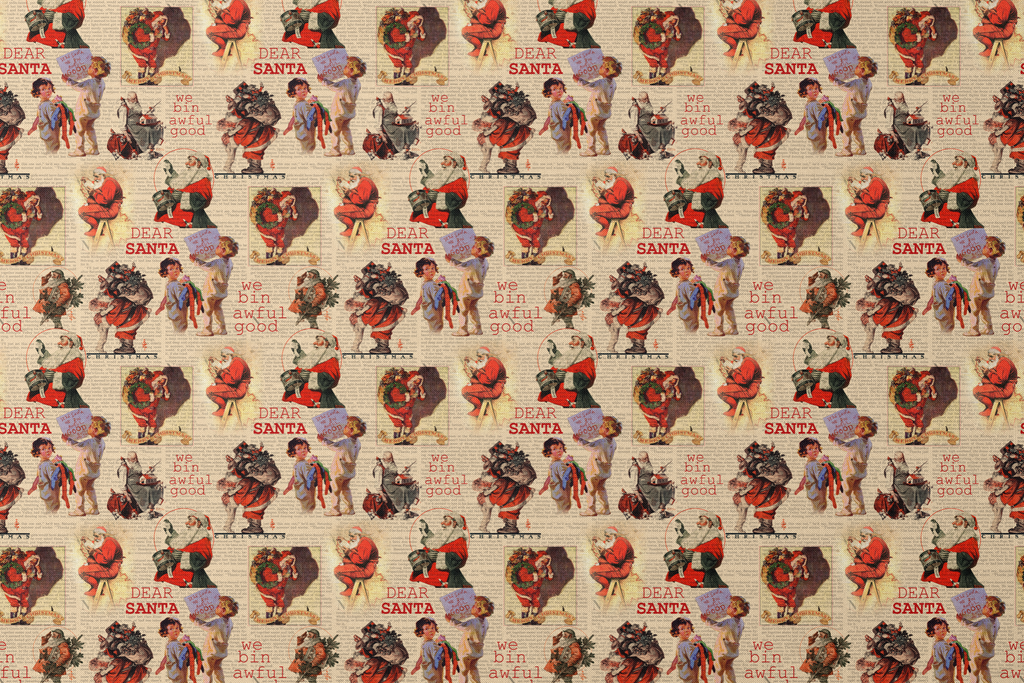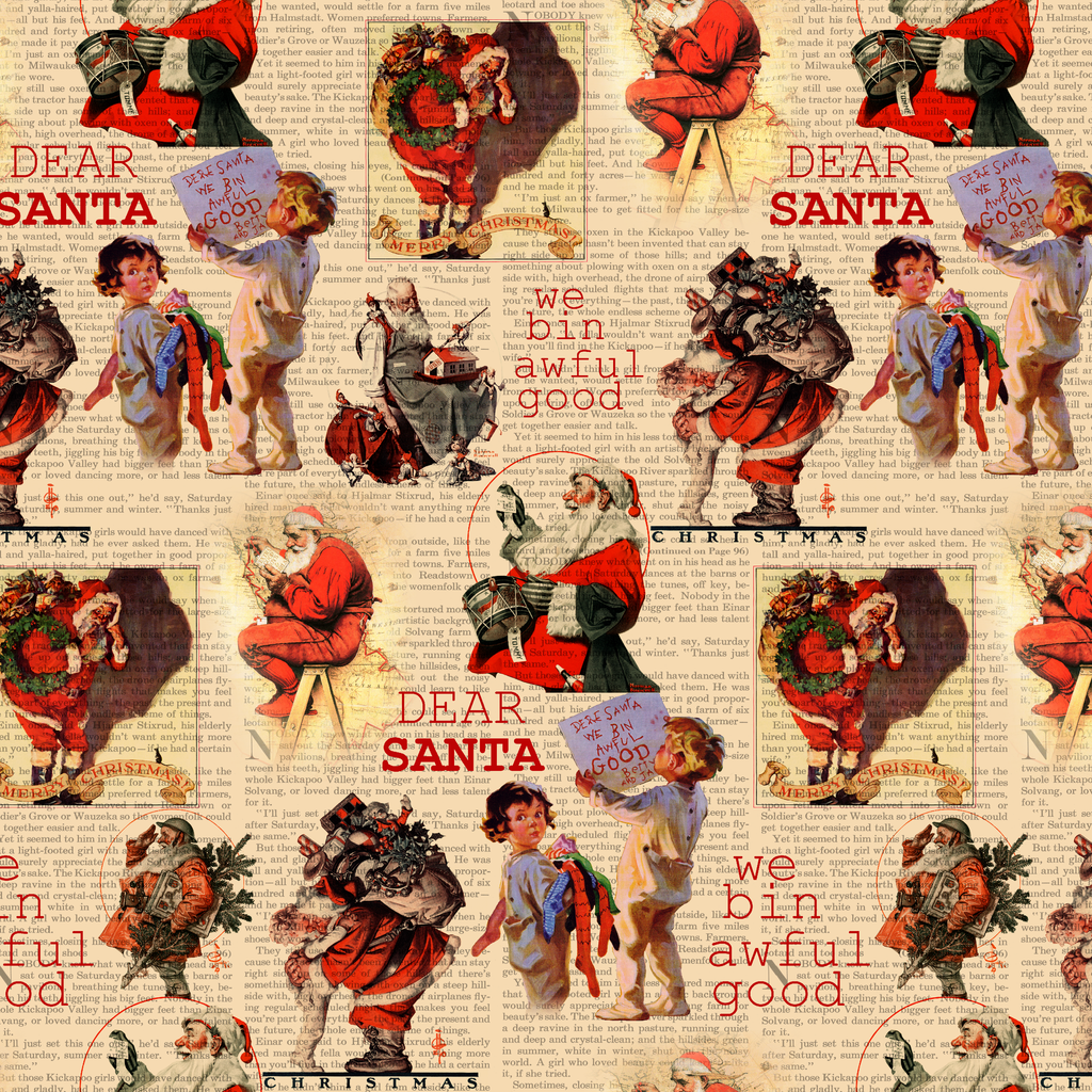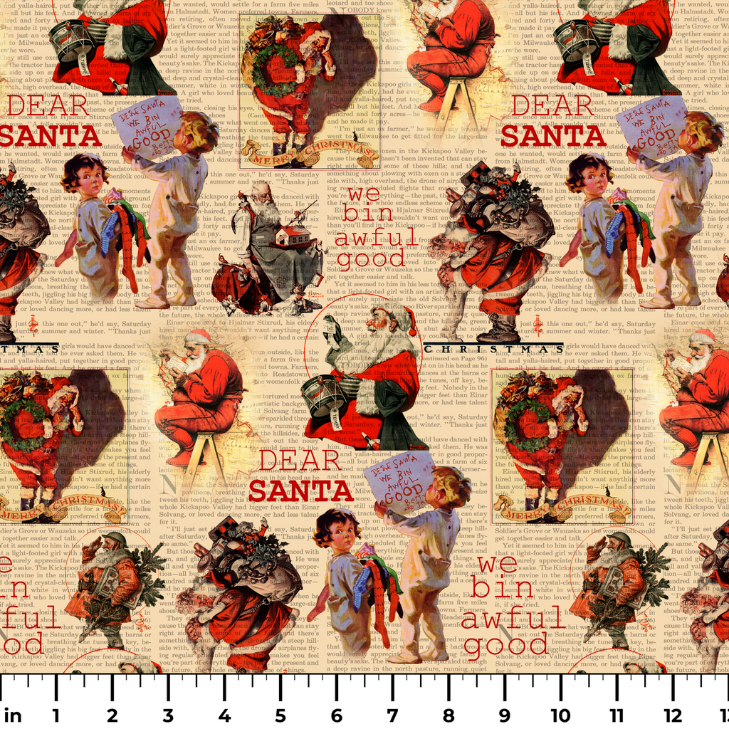 This nostalgic Christmas fabric features charming vintage Santa imagery layered over antique newspaper text. Bold red "DEAR SANTA" lettering and "we bin awful good" child-written notes create a whimsical collage effect, while classic illustrations of Santa carrying his sack of toys evoke heartwarming holiday traditions. Perfect for creating festive table runners, stockings, or special holiday quilting projects that capture the wonder and magic of Christmas past.