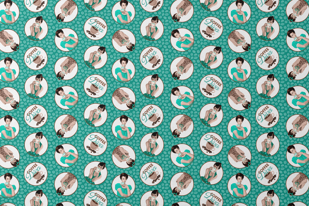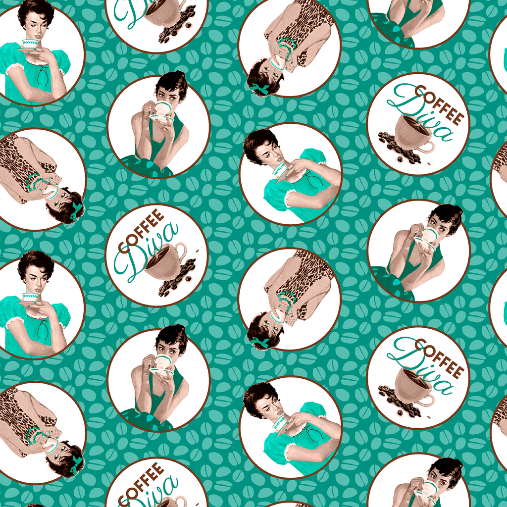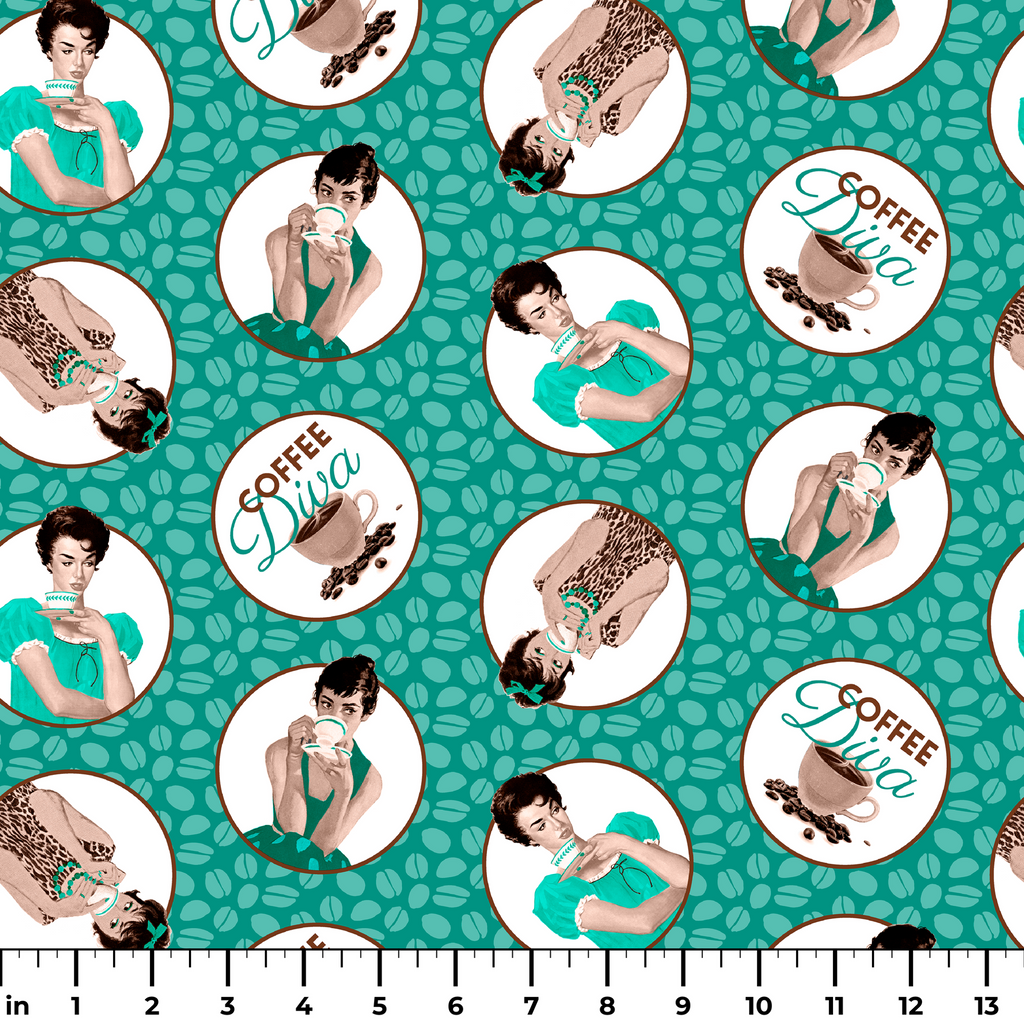 This delightful retro-inspired fabric features circular vignettes on a vibrant teal background speckled with coffee bean silhouettes. The circular medallions showcase vintage-style illustrations and "Coffee Diva" text in rich brown and teal lettering, creating a perfect nostalgic cafe vibe. This eye-catching fabric would make stunning kitchen curtains, aprons, or cafe table linens for the coffee enthusiast who appreciates a touch of mid-century charm.