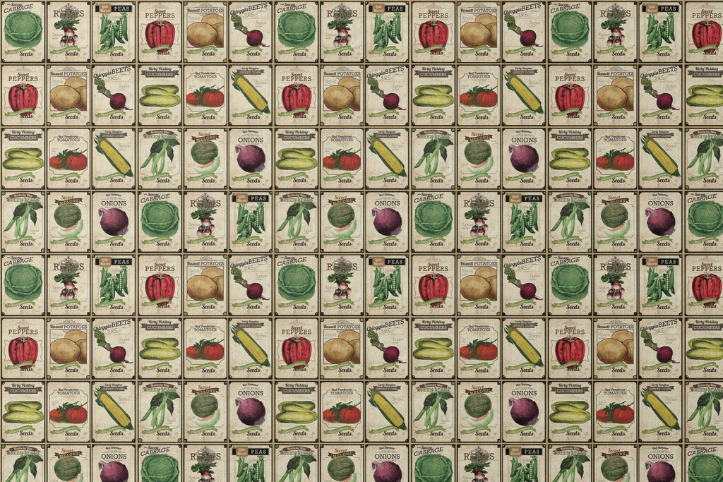 Step back in time with this charming vintage vegetable seed packet design featuring beautifully illustrated garden favorites against aged parchment backgrounds. The collection showcases colorful heirloom varieties including Savoy Cabbage, Cherry Belle Radishes, Sweet Peppers, Russell Potatoes, and more—each rendered in rich, earthy tones, antique typography and the "Country Gentleman's Seeds" banner. Perfect for kitchen decor projects or creating unique garden-themed quilts and aprons.