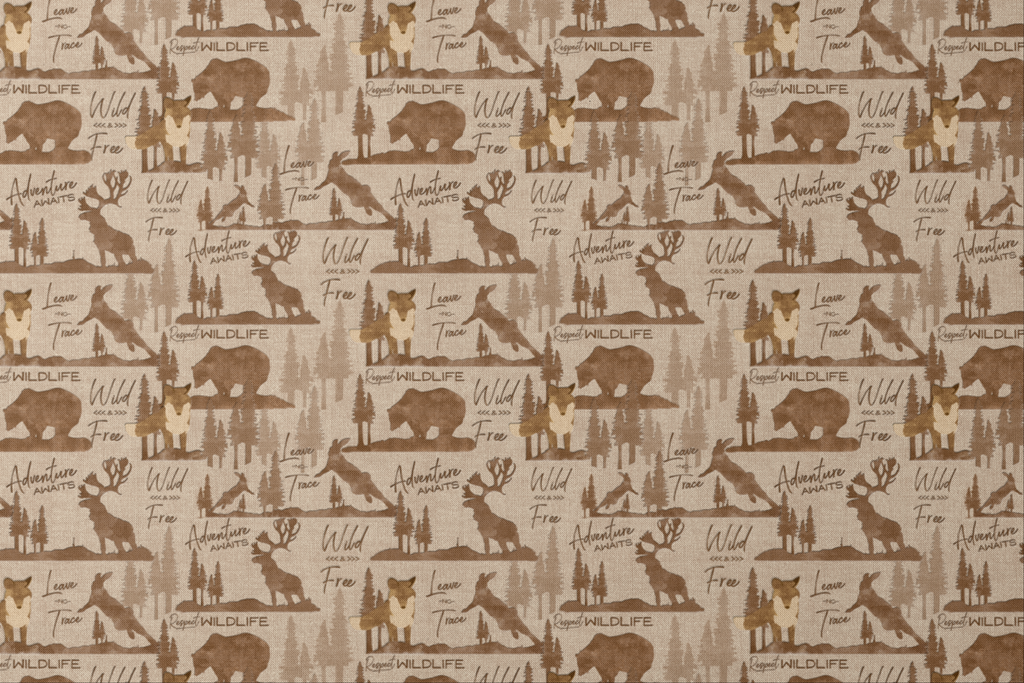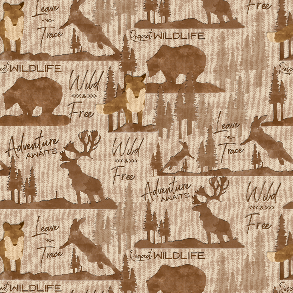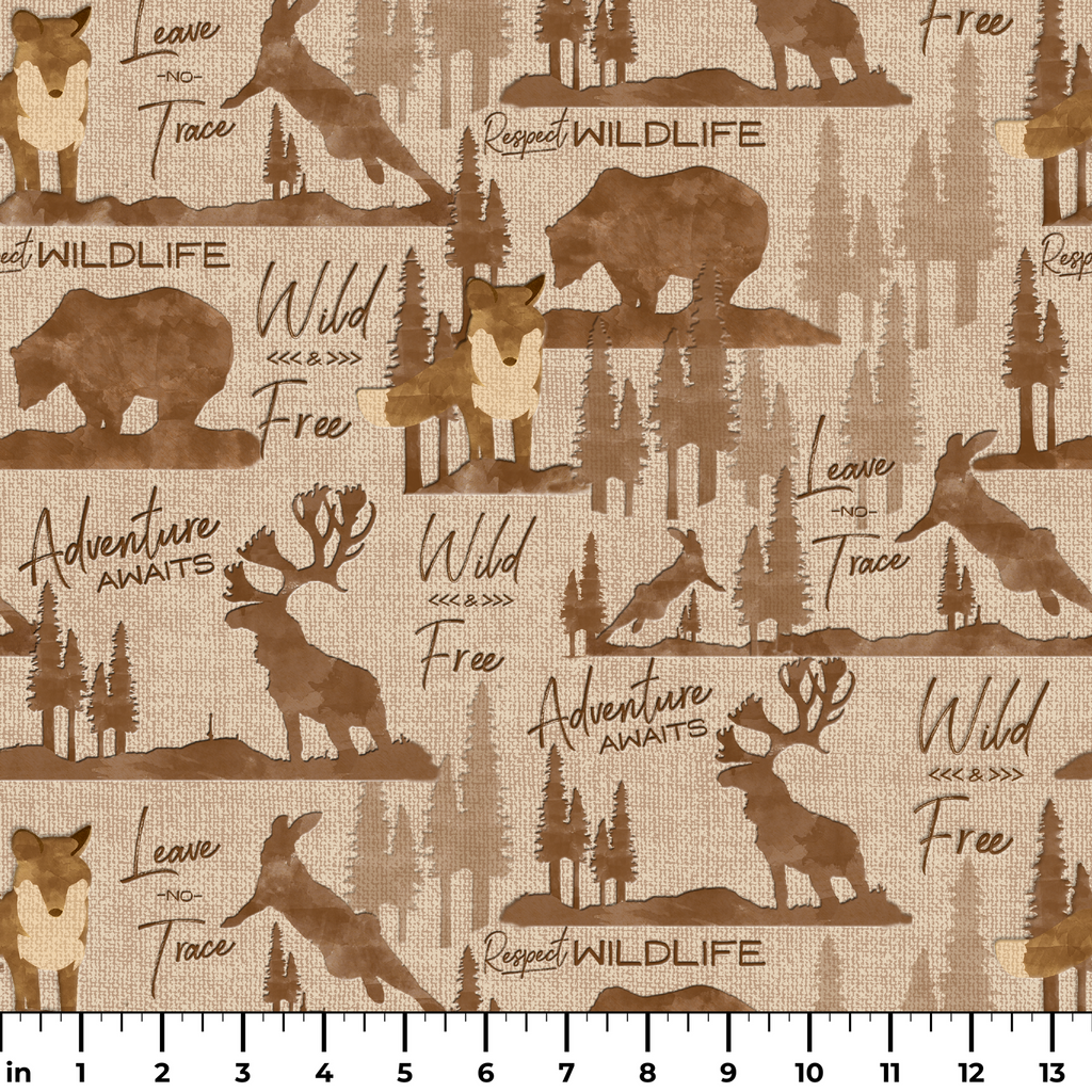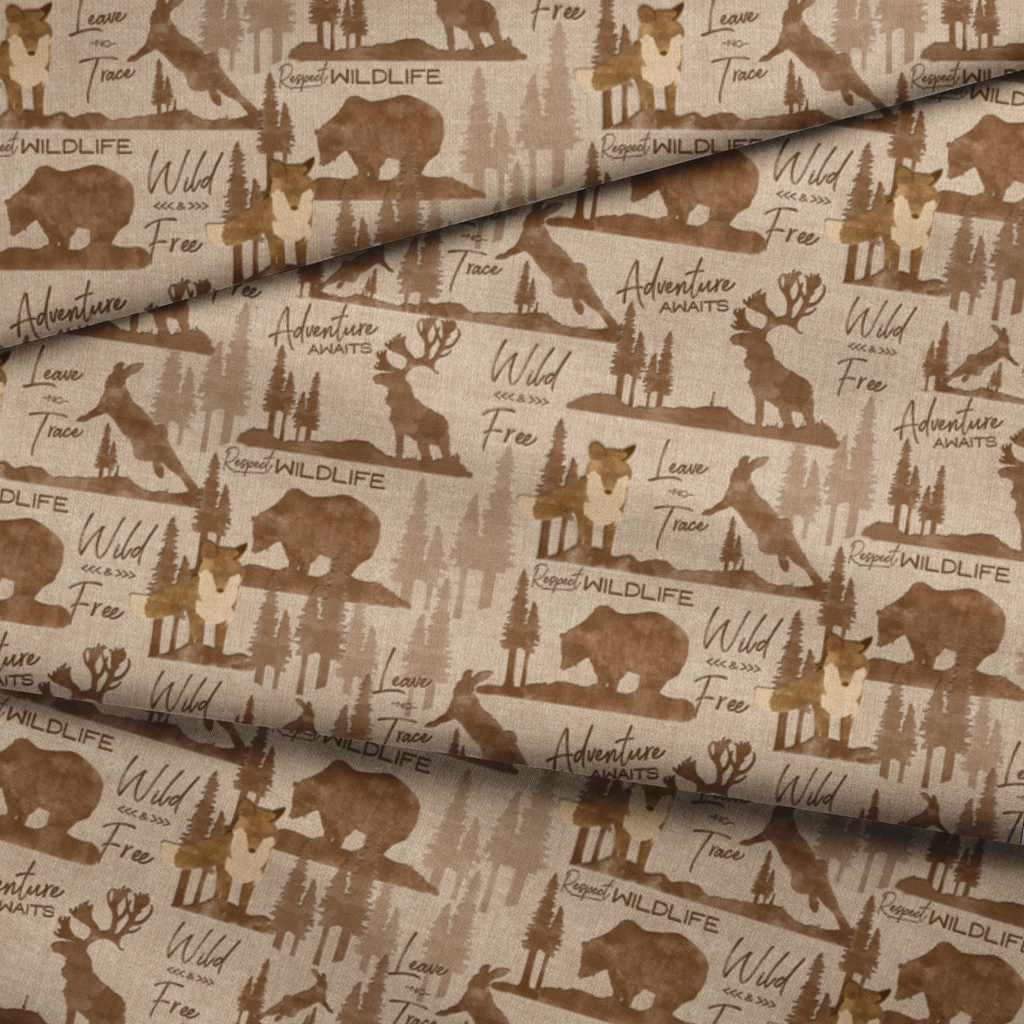 Rustic woodland silhouettes dance across a natural beige backdrop in this earthy, adventure-themed fabric. Rich brown outlines of foxes, bears, rabbits, and elk are scattered among pine trees, complemented by inspiring phrases like "Adventure Awaits," "Wild & Free," and "Respect Wildlife." This outdoorsy print brings the majesty of nature indoors, perfect for cabin decor projects, rustic quilts, or wilderness-themed nursery accessories.