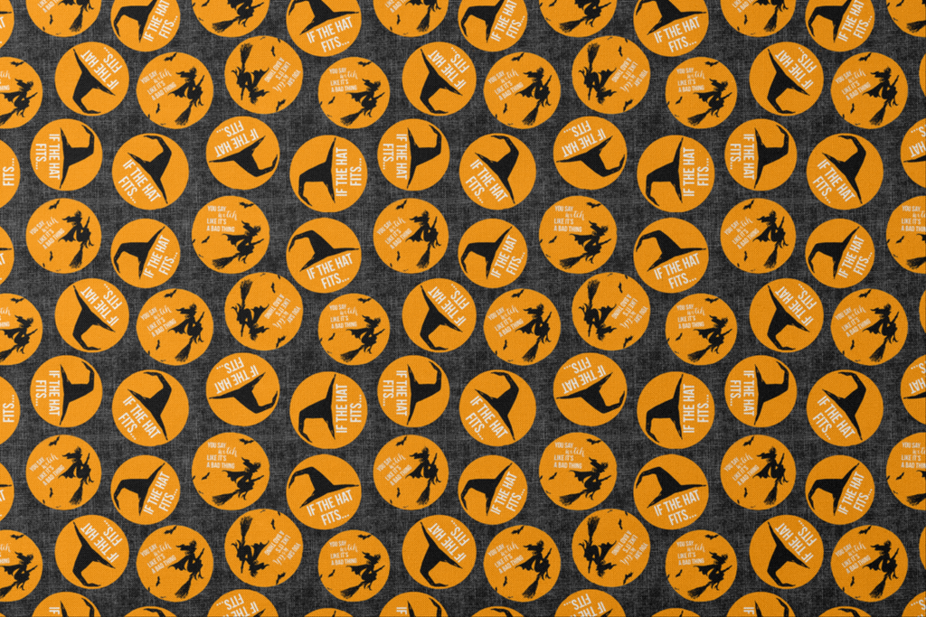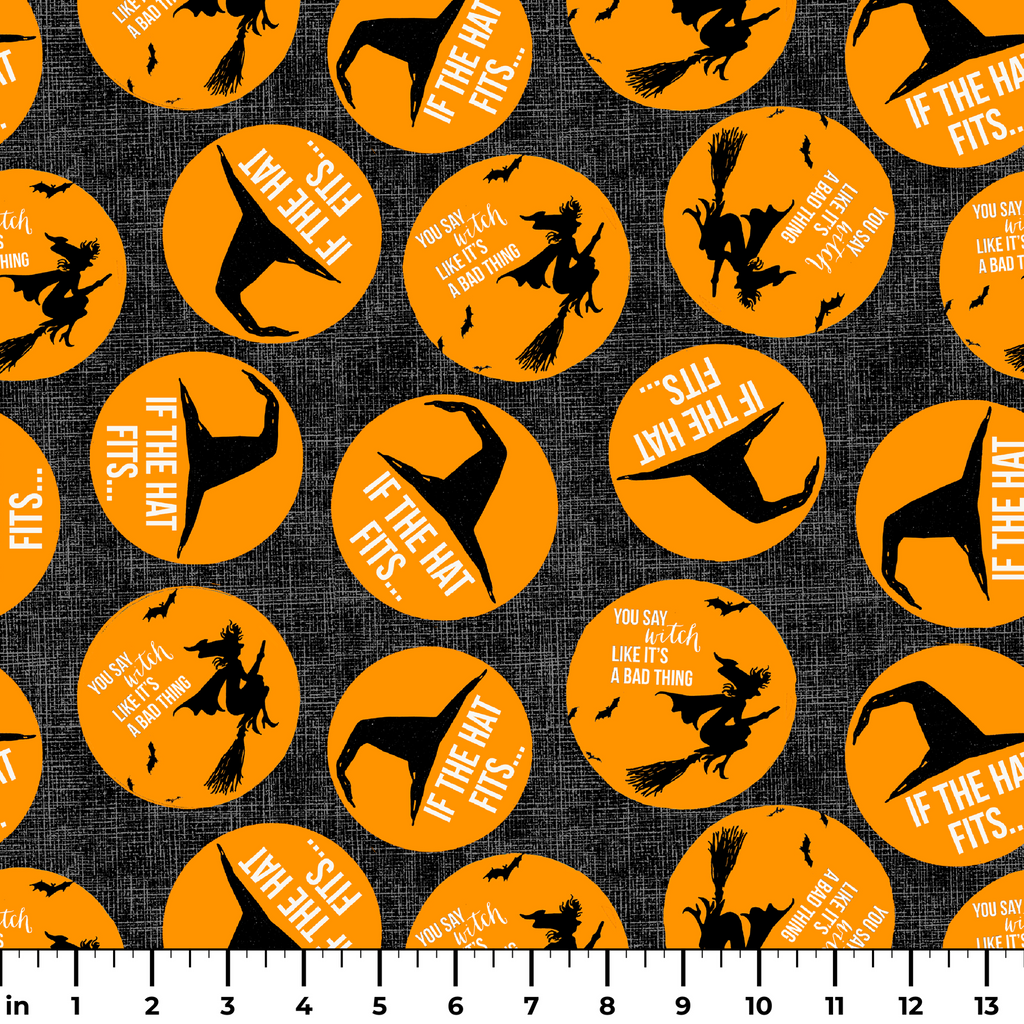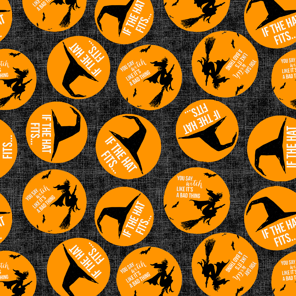 Vibrant orange circles pop against a textured charcoal background, featuring silhouettes of witches on broomsticks and pointed witch hats with playful text: "If the hat fits..." and "You say witch like it's a bad thing." The whimsical Halloween-themed design combines vintage charm with a dash of sass, making it perfect for festive table runners or a spellbinding trick-or-treat bag.