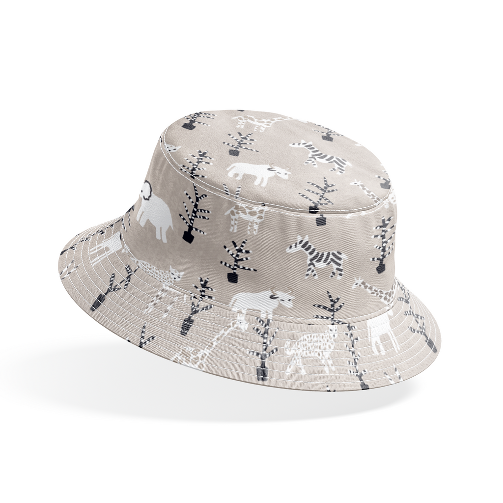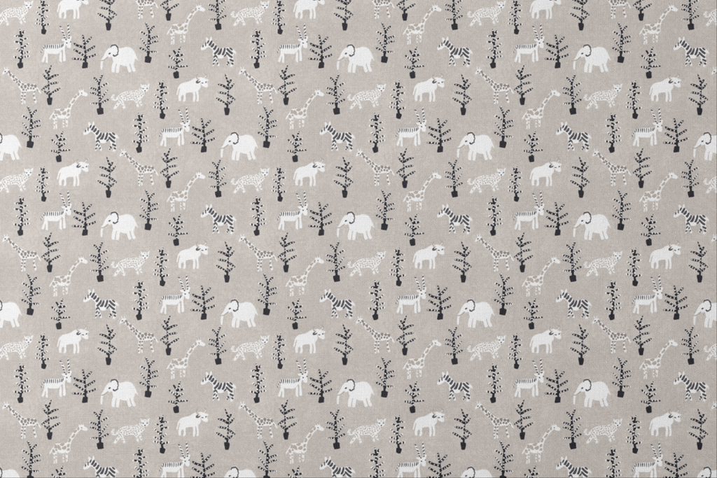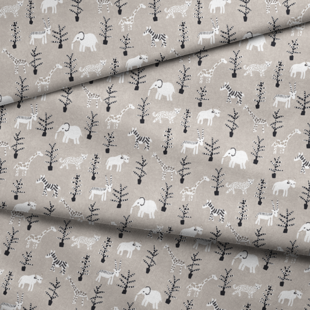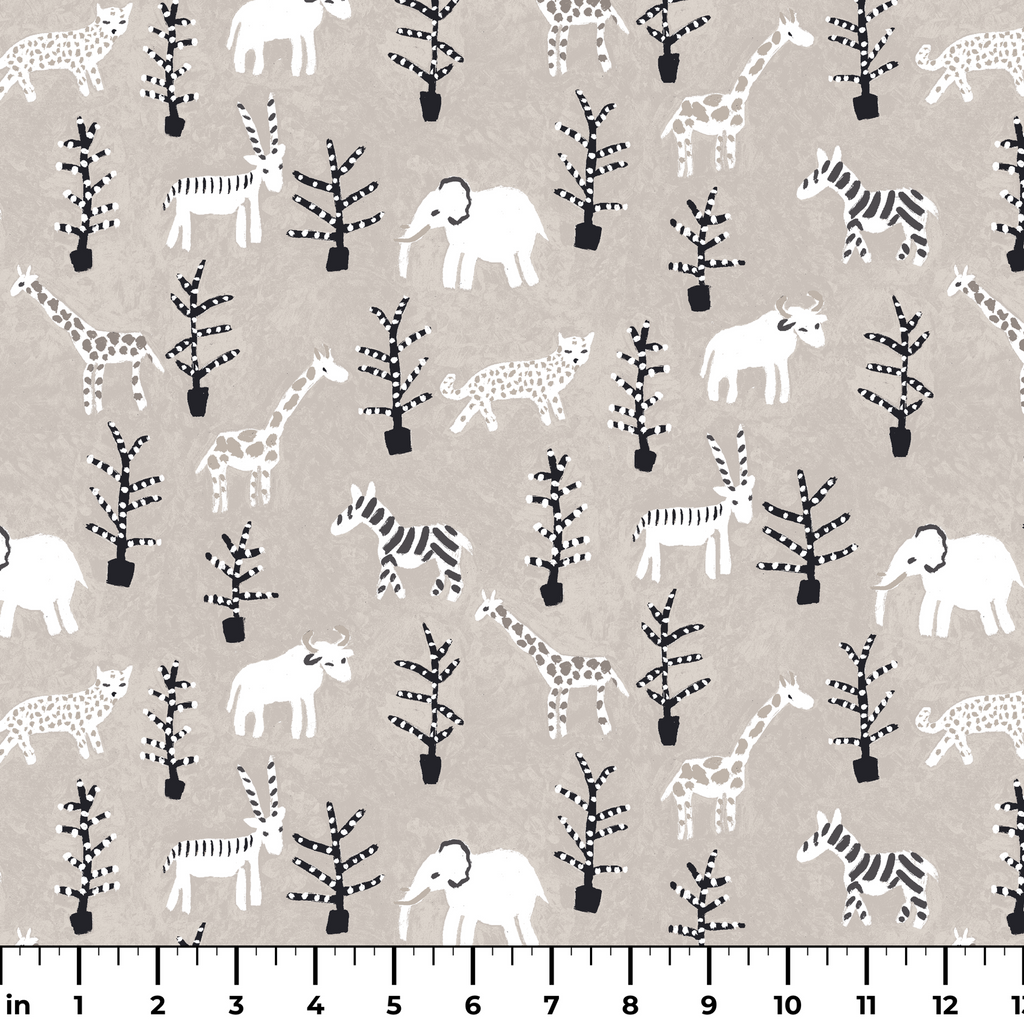 Whimsical safari animals pattern featuring leopards, elephants, giraffes and zebras in white silhouettes against a soft gray background with stylized black trees, perfect for modern nursery decor.