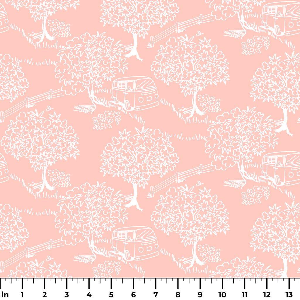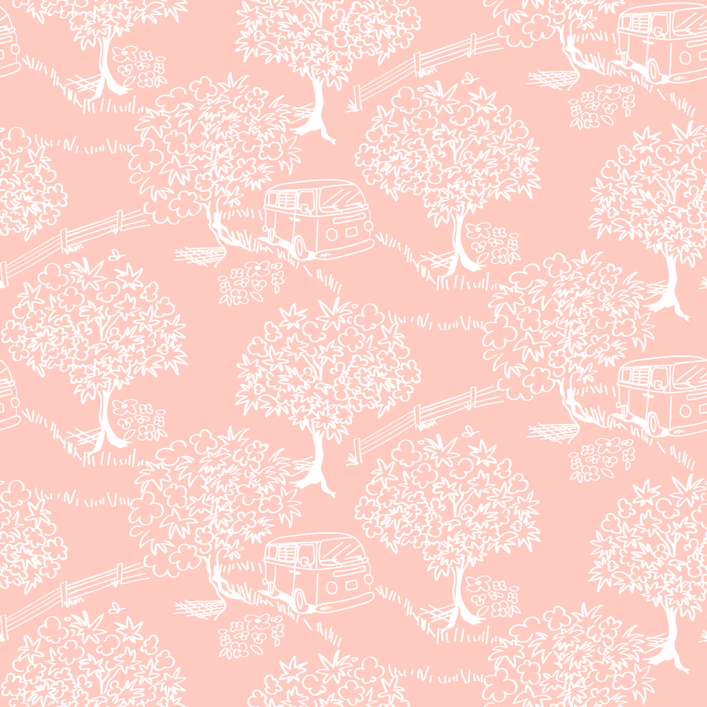 Dreamy pink and white retro pattern featuring lush trees and a vintage camper van, perfect for bohemian home decor with a whimsical travel theme.