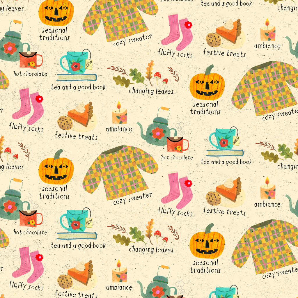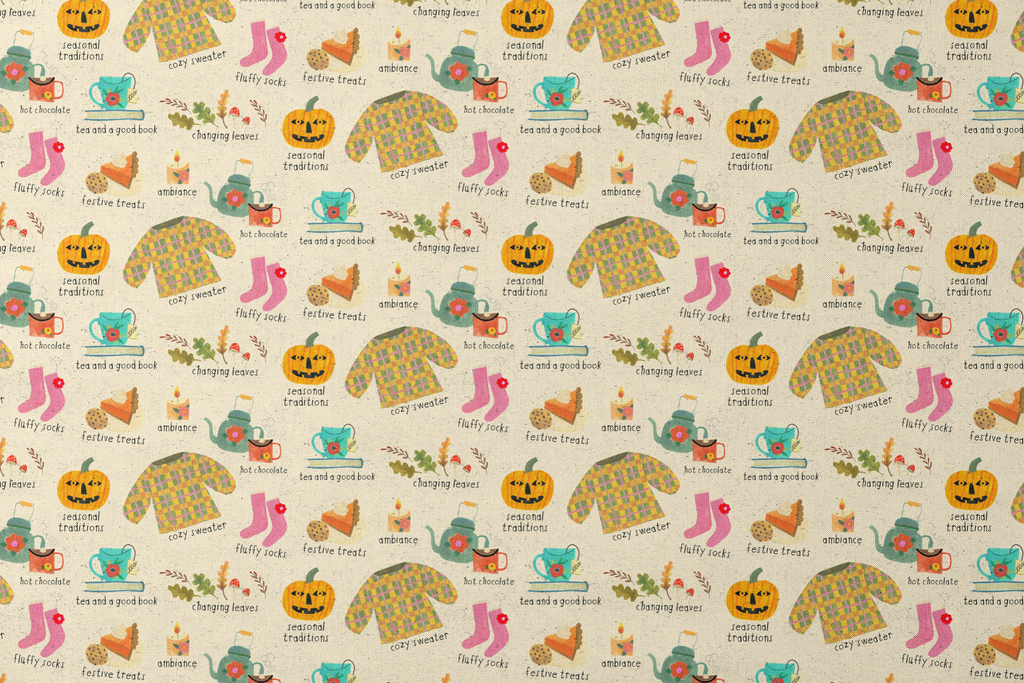 Cozy fall pattern featuring seasonal icons like jack-o-lanterns, sweaters, fluffy socks, and hot beverages. Perfect for autumn-themed home decor or festive apparel.