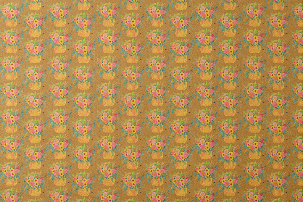 Vibrant autumn floral arrangements in bright pumpkin vases against a dark mustard gold background. Features cheerful sunflowers, pink roses, and lush greenery in a whimsical seasonal pattern.