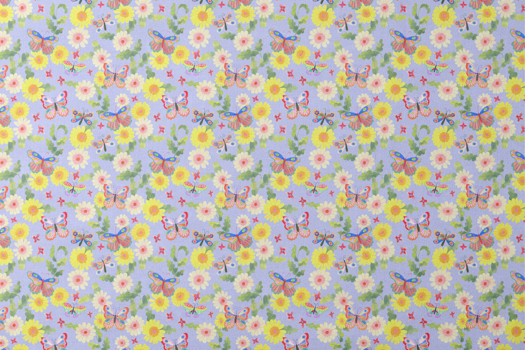 Vibrant butterflies flutter among cheerful daisies on a soft lavender background in this whimsical, spring-inspired floral pattern.