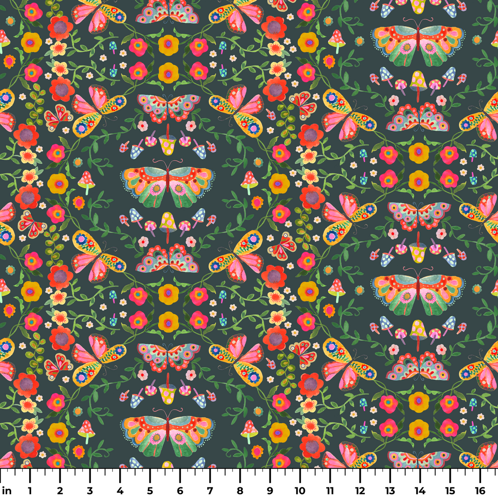 Shannon Snow Butterfly Garden on Dark Green Fabric