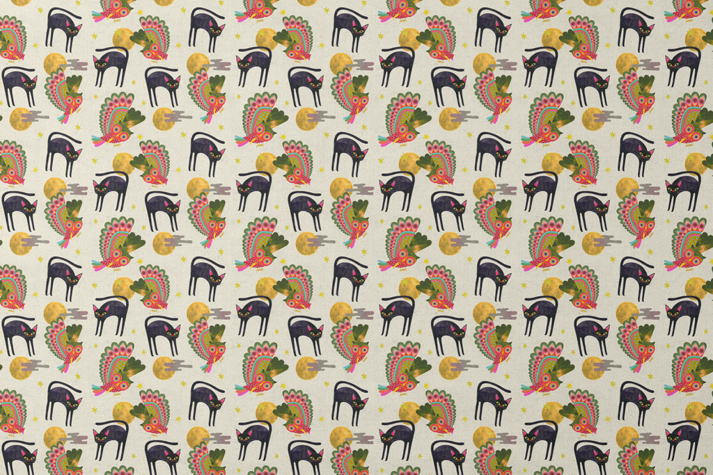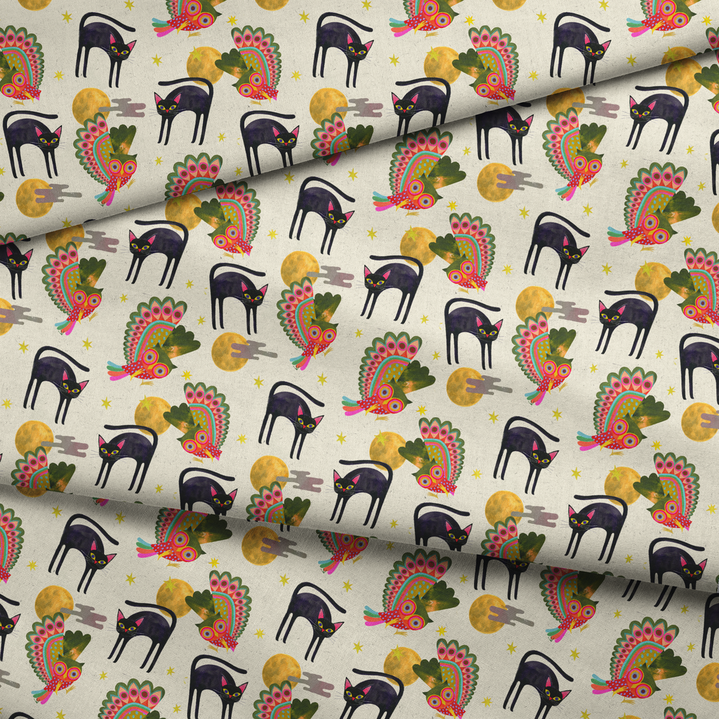 Whimsical black cats prowl among colorful owl-like birds and golden moons on a textured cream background. Perfect for home decor with a playful, folk art aesthetic and vibrant color palette.