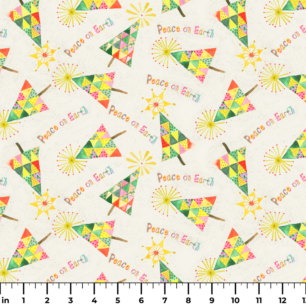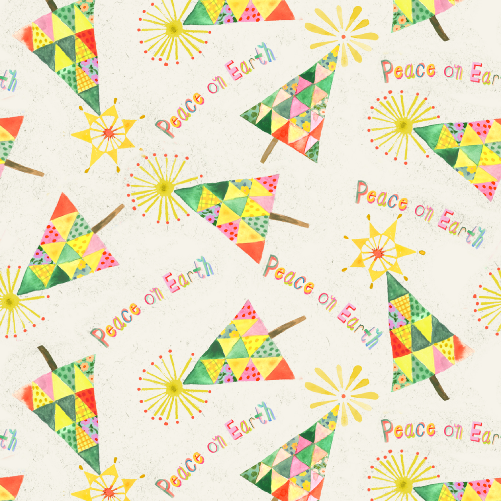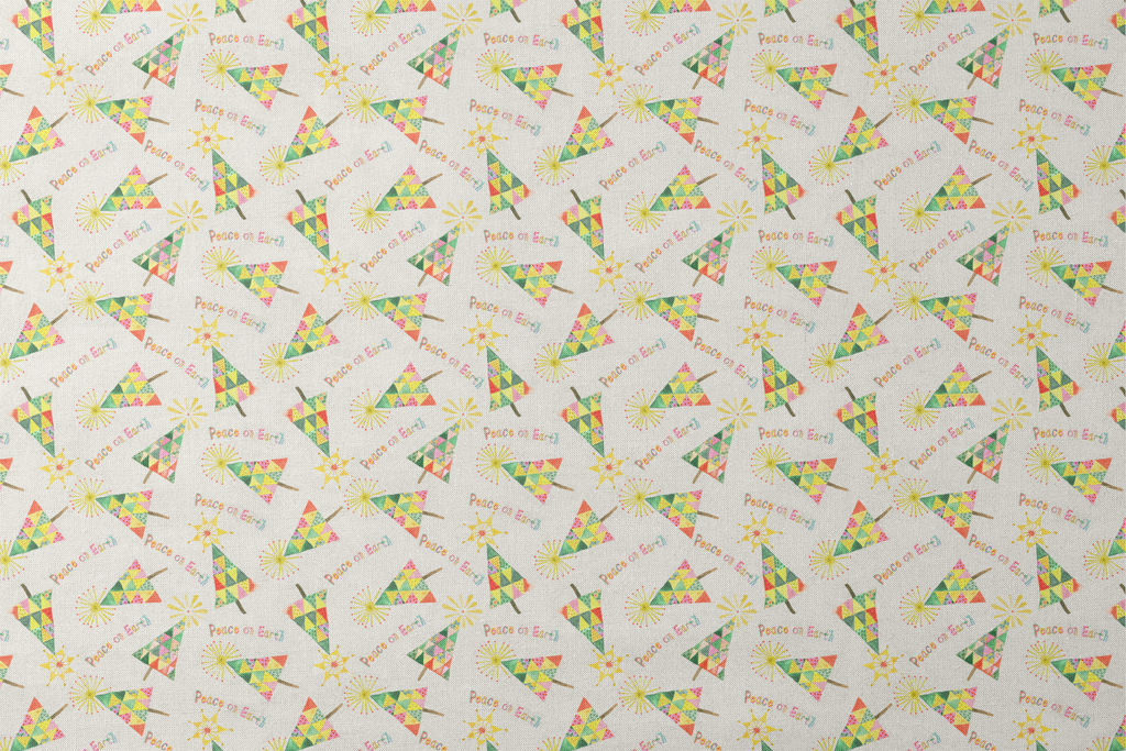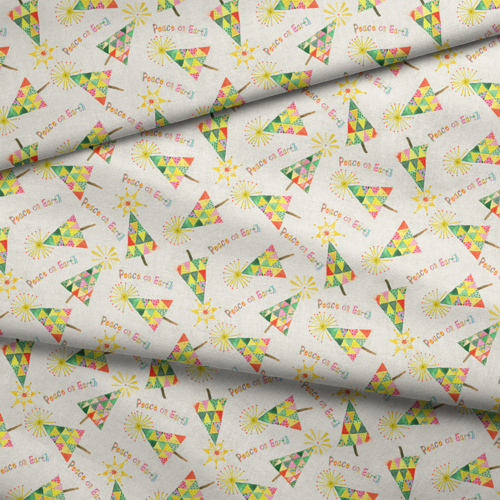Festive Christmas design featuring colorful geometric triangular trees with "Peace on Earth" message and starburst toppers, in a cheerful holiday palette of green, yellow, and pink.