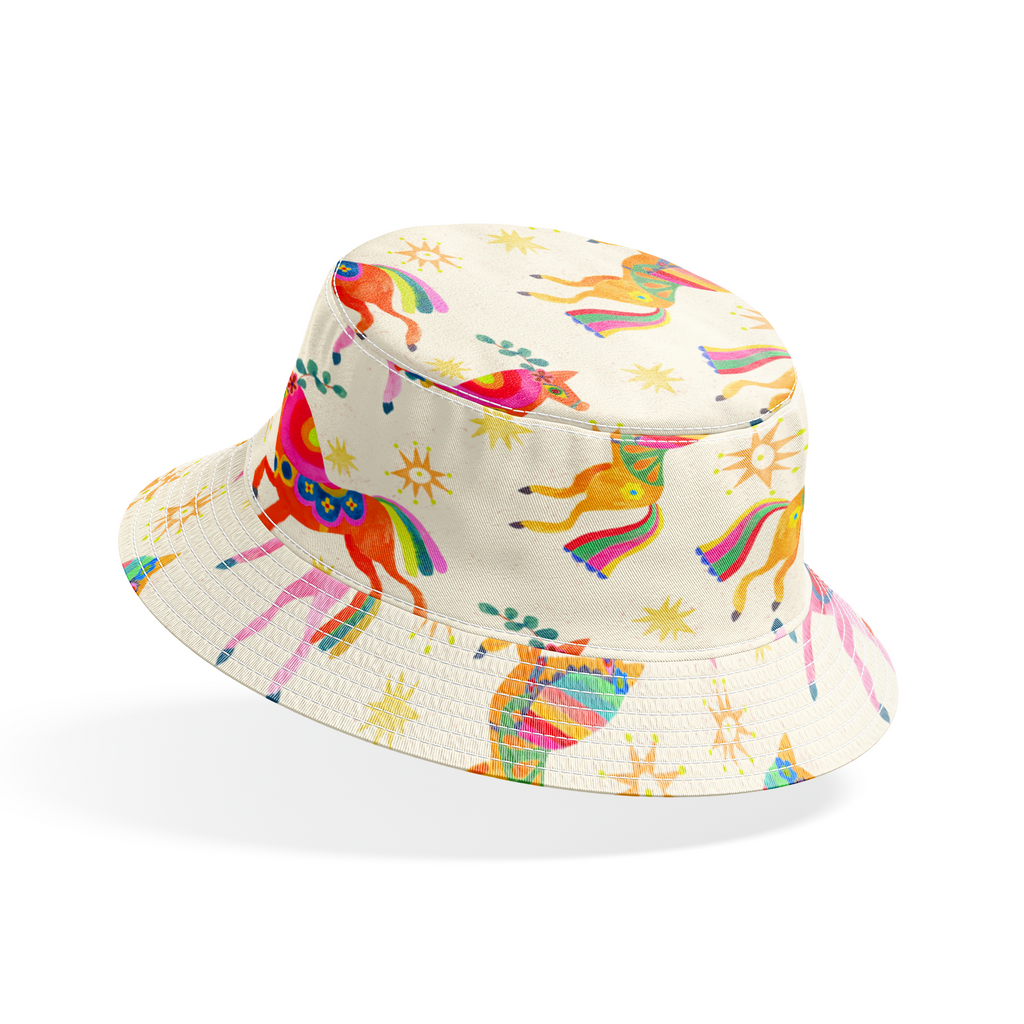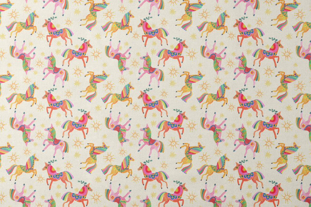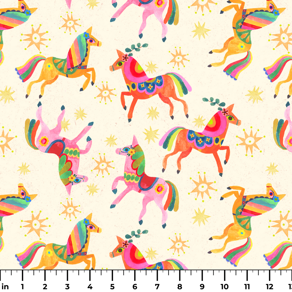 Whimsical rainbow horses gallop across a dreamy pattern featuring vibrant pink, orange, and blue colorways with sunny star accents - perfect for children's decor, quilting, or playful apparel designs.
