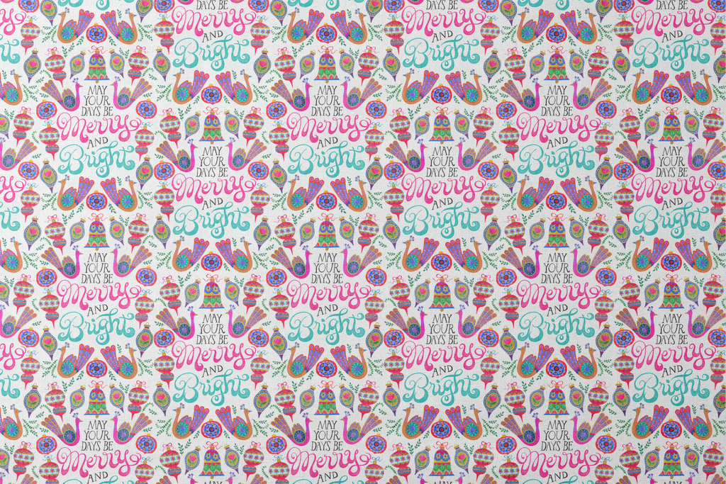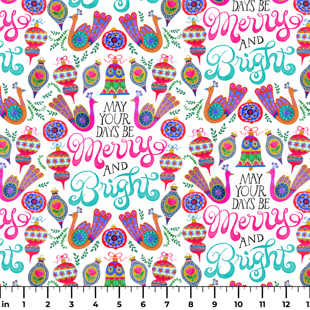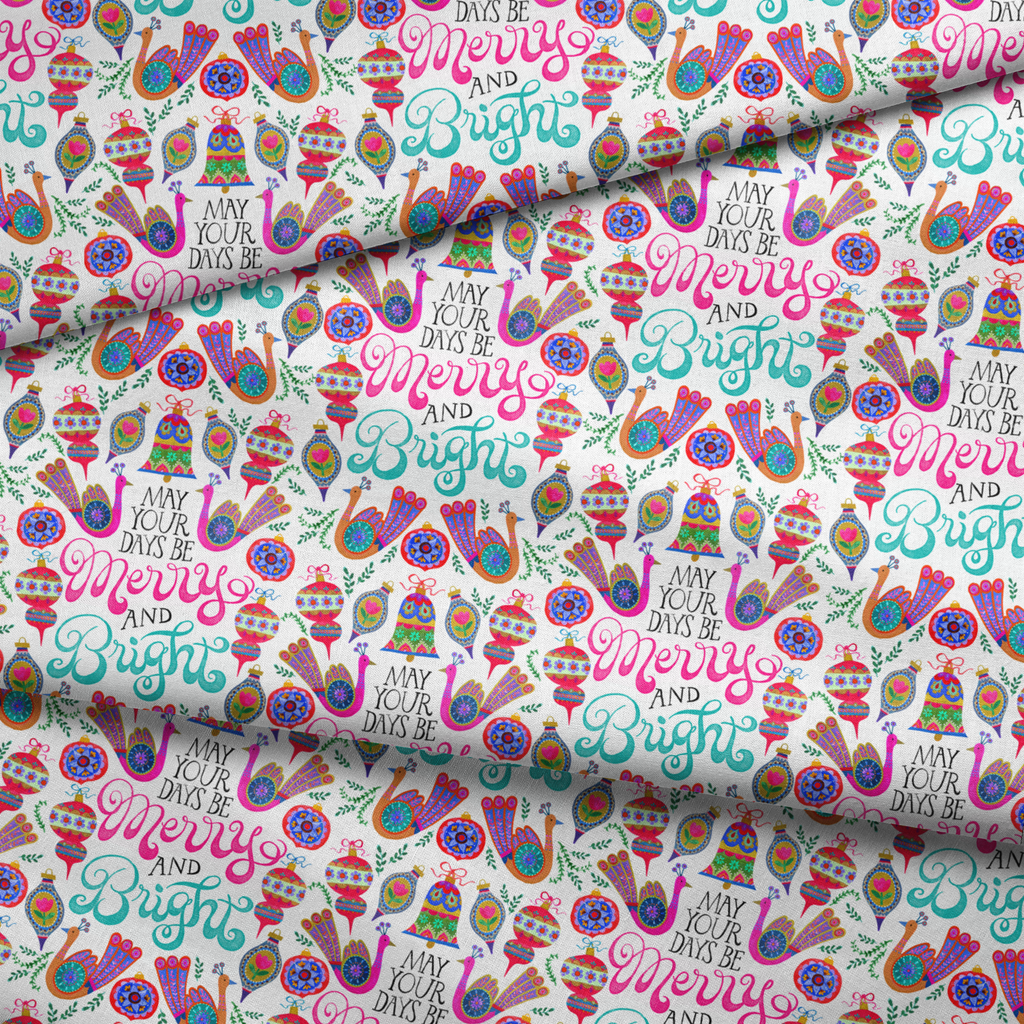 Festive ornament and stylized bird pattern in bright pink, teal, and purple with cheerful "May Your Days Be Merry and Bright" holiday messaging, perfect for quilted tree skirts and non-traditional wrapping.