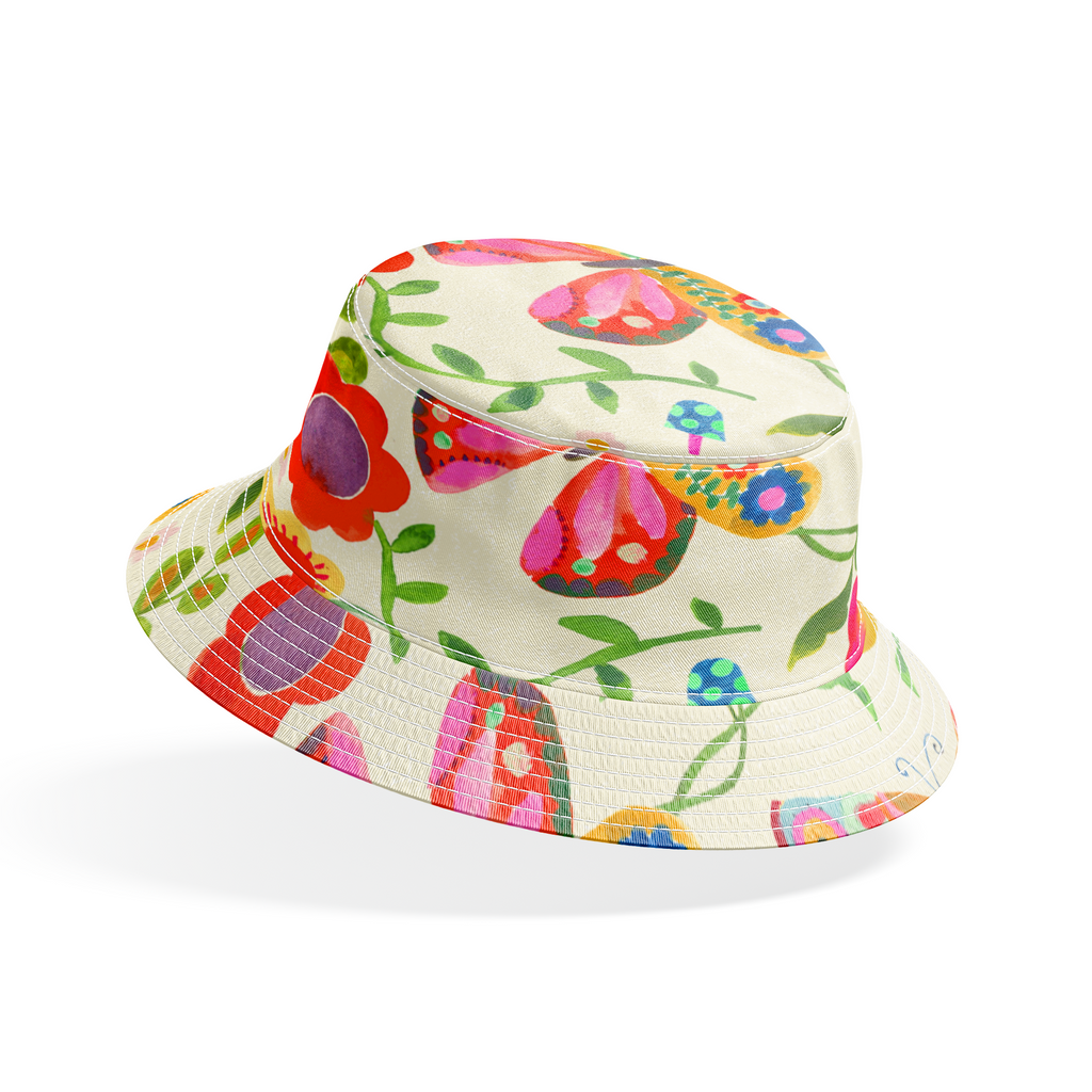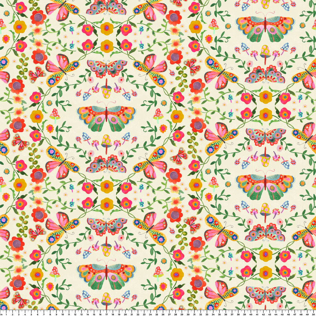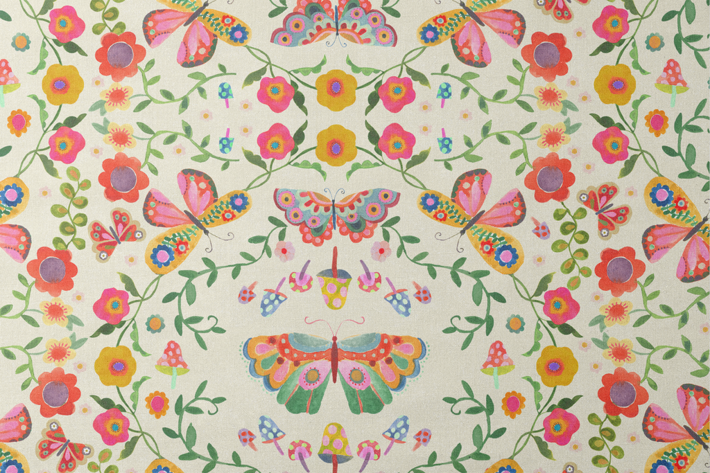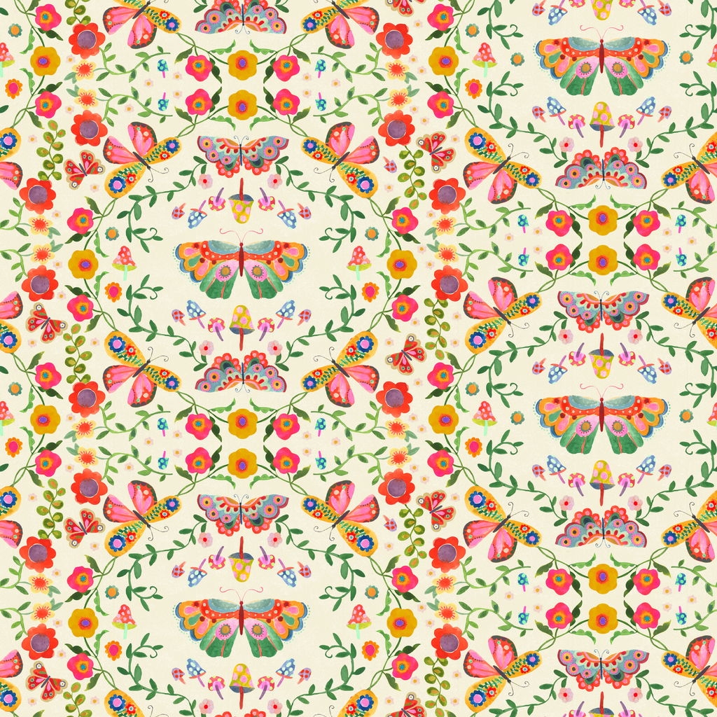 This cheerful folk-inspired pattern features colorful butterflies and flowers in a symmetrical layout. Whimsical botanical motifs in bright pink, orange and yellow create a romantic spring aesthetic perfect for home decor or apparel.