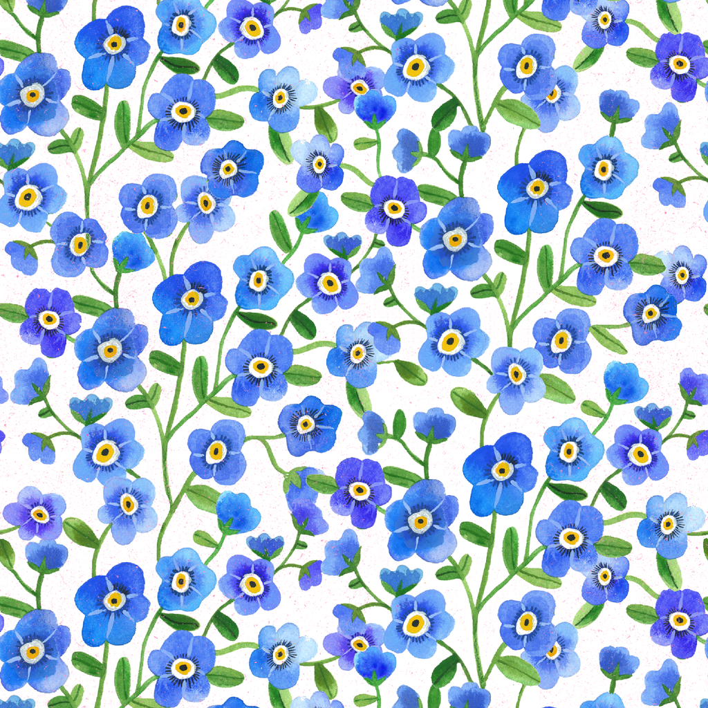 Delicate forget-me-not blue flowers create a whimsical, all-over floral pattern with vibrant petals and green stems, perfect for a fresh spring look in home decor or fashion.