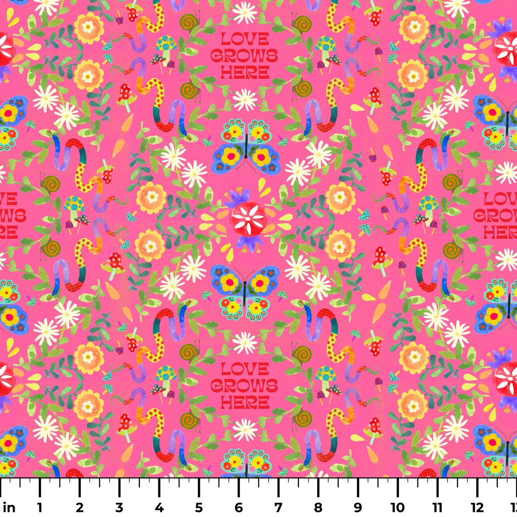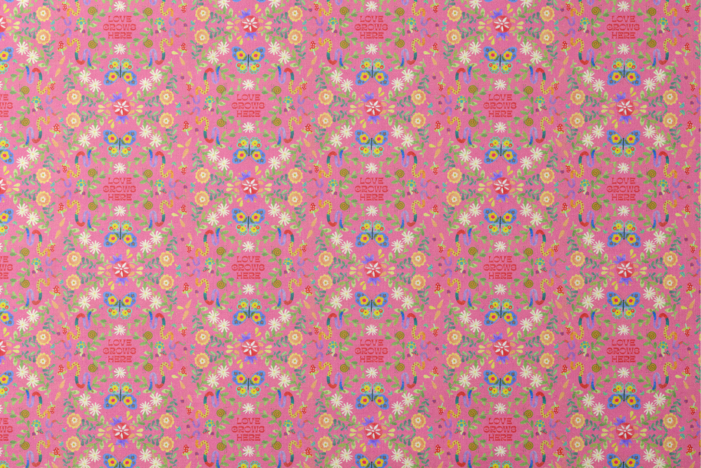 Vibrant pink floral pattern with colorful butterflies, daisy blooms, the quote "Love Grows Here" and whimsical folk art motifs. Perfect for bohemian home decor or apparel with its playful, retro-inspired design.