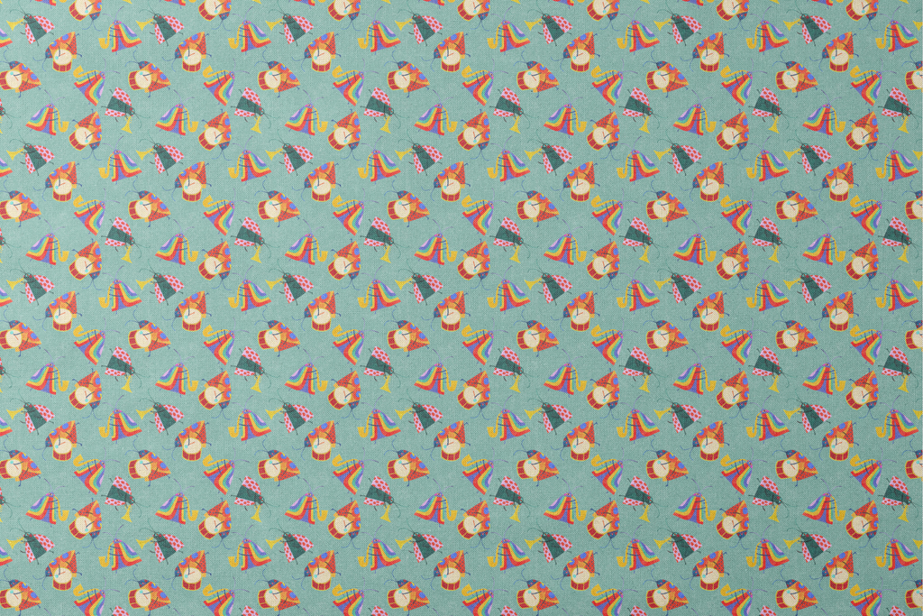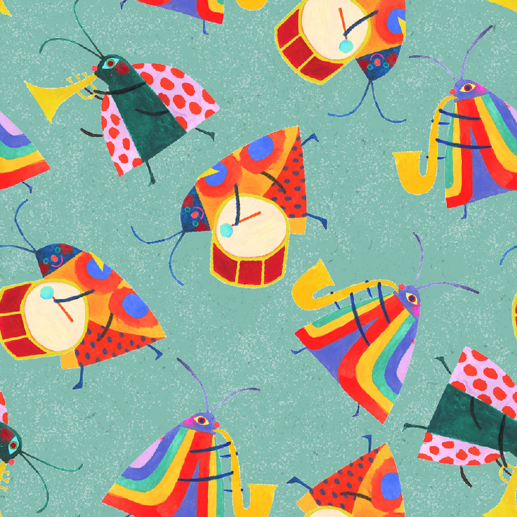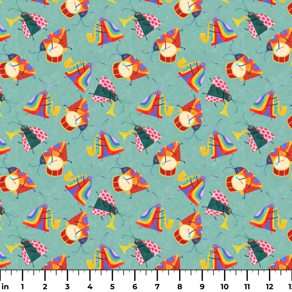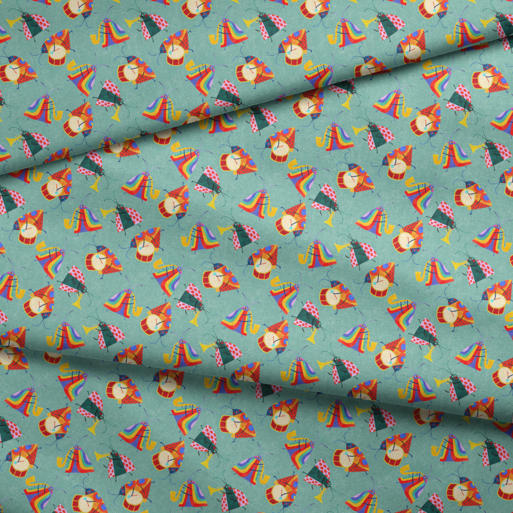 Colorful bugs playing musical instruments pattern featuring drums, trumpets, and stylized instruments on a teal blue background, perfect for children's apparel or party decor.