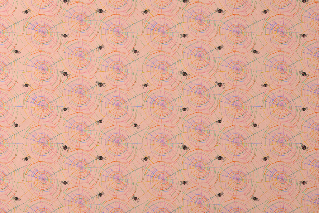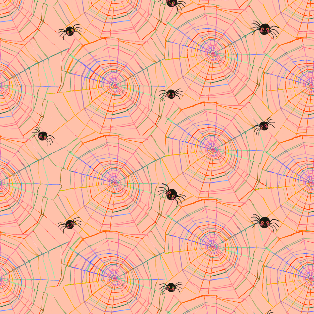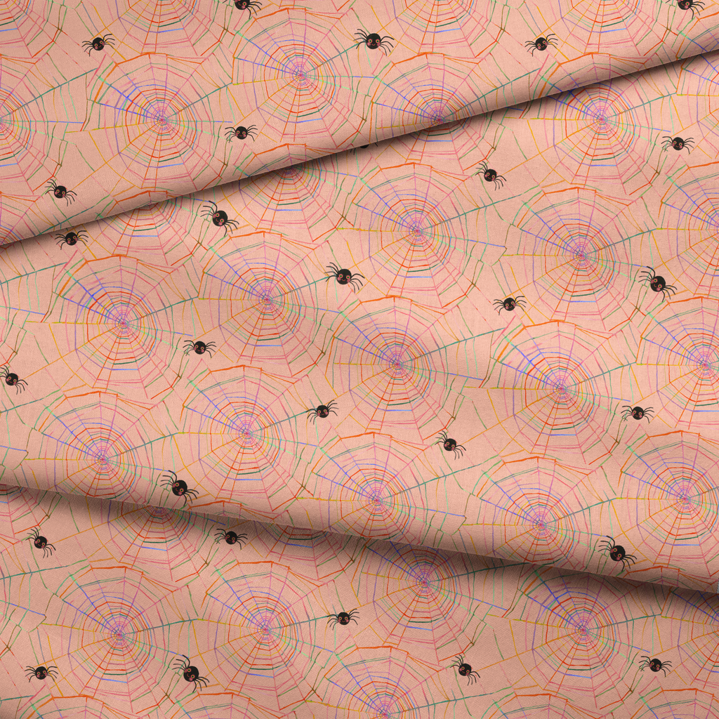 Colorful spiderweb pattern featuring black spiders on a peachy pink background with multicolored web designs. Perfect for Halloween decor or spooky-themed projects.