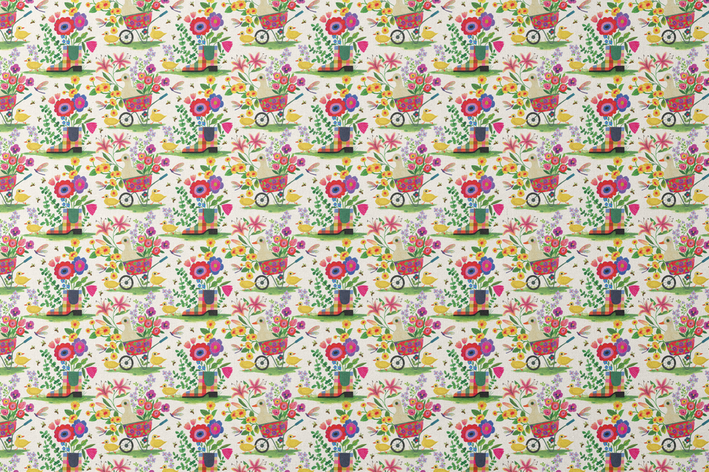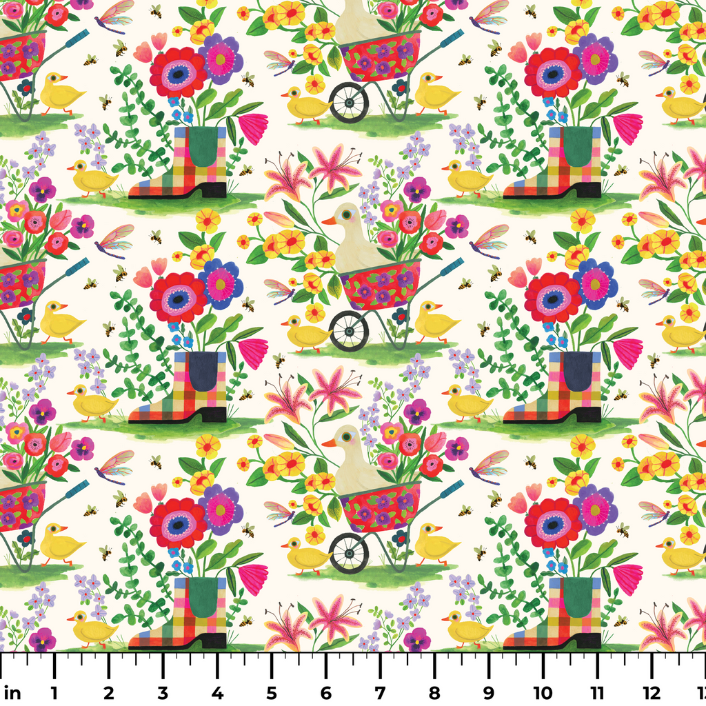Cheerful garden floral pattern with vibrant poppies, daisies, and playful yellow birds. Whimsical arrangement features colorful blooms in boots and decorative elements against a cream background.