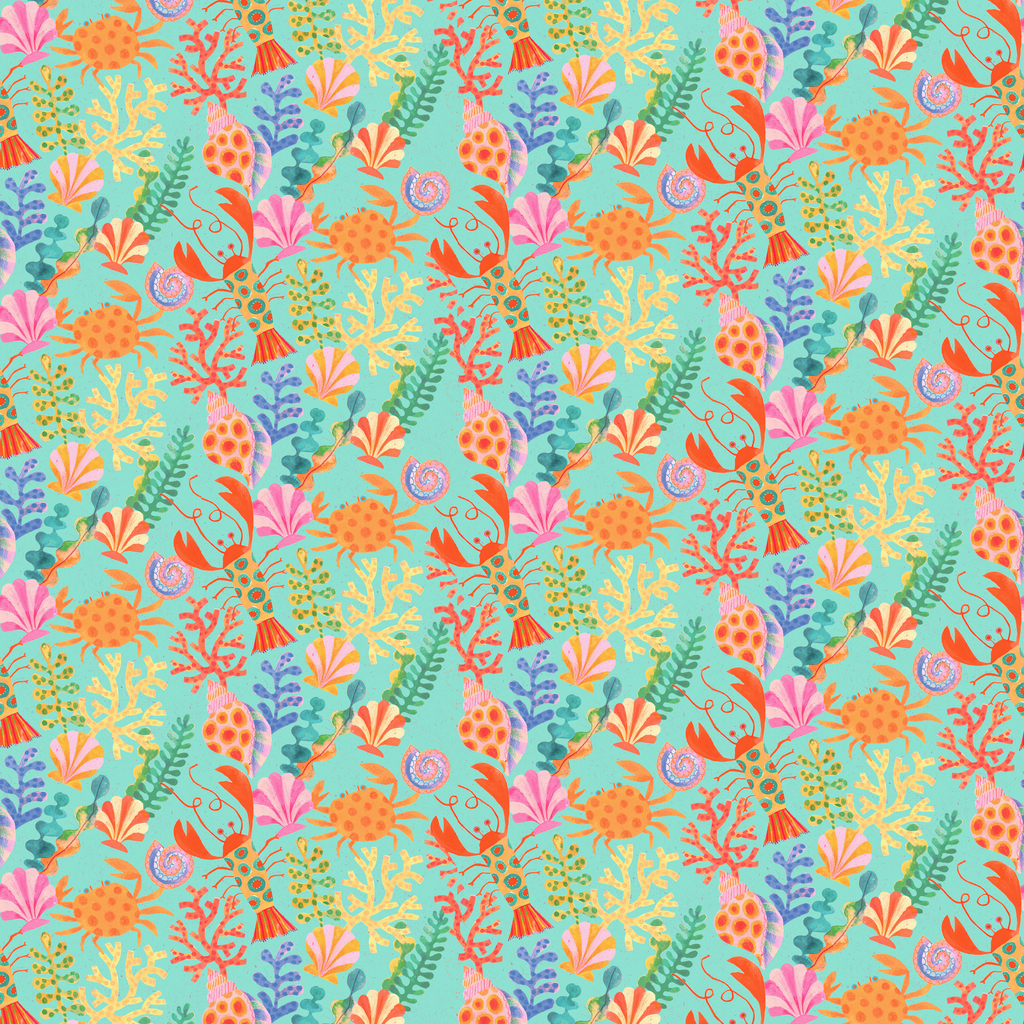 Vibrant underwater creatures with seaweed, lobsters, seashells, and whimiscal crabs against a turquoise background, creating a playful, retro-inspired design perfect for summer apparel or home decor.