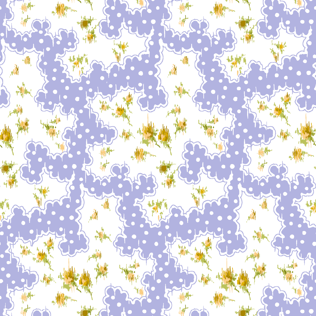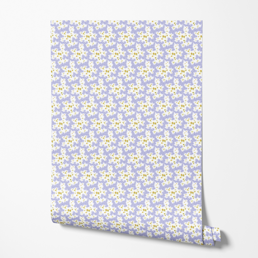 Whimsical purple floral pattern with delicate white flowers and golden accents on a dreamy lavender background with polka dots.