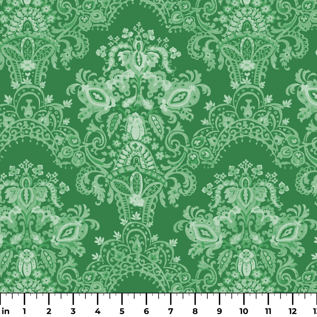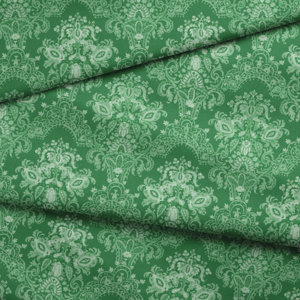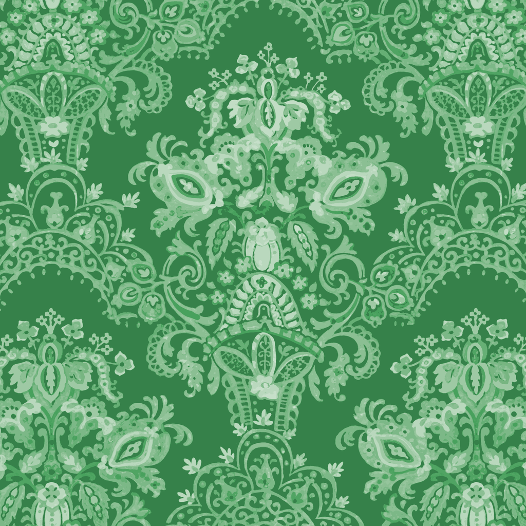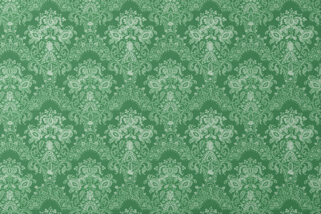 Elegant green damask pattern featuring ornate traditional motifs creating a rich, heritage look perfect for traditional or seasonal home decor and upholstery.