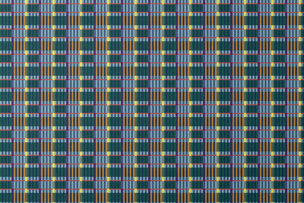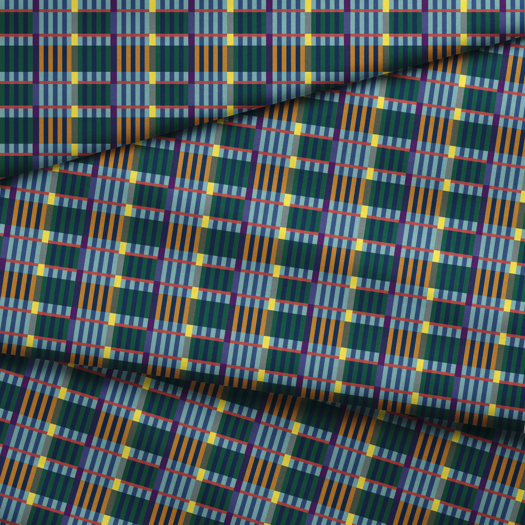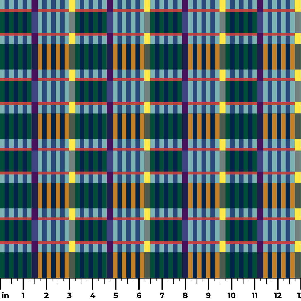 Vibrant contemporary plaid with geometric stripes in deep navy, forest green, turquoise, and golden orange, creating a bold modern pattern perfect for upholstery or home decor accents.