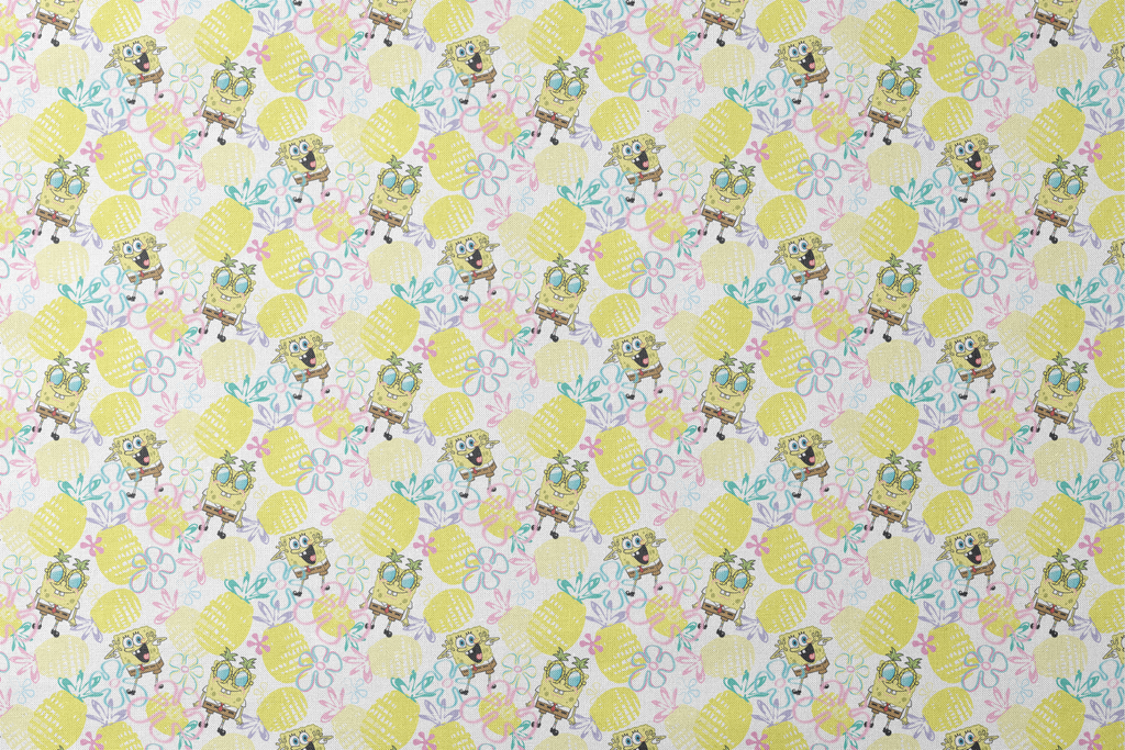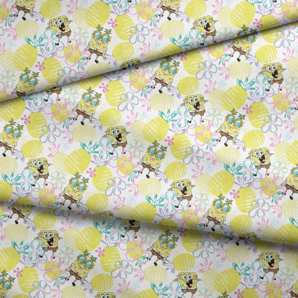 Officially licensed SpongeBob SquarePants design featuring SpongeBob in pineapple-shaped glasses, surrounded by yellow pineapples and pastel floral sketches on a bright white background. A fun, tropical design perfect for kids’ apparel, accessories, and home decor.