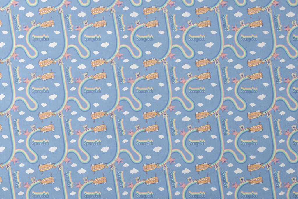 Officially licensed SpongeBob SquarePants fabric featuring SpongeBob and Patrick riding rainbow roads through clouds in retro orange sea buses. A bright, surreal pattern for kids’ apparel and imaginative decor.