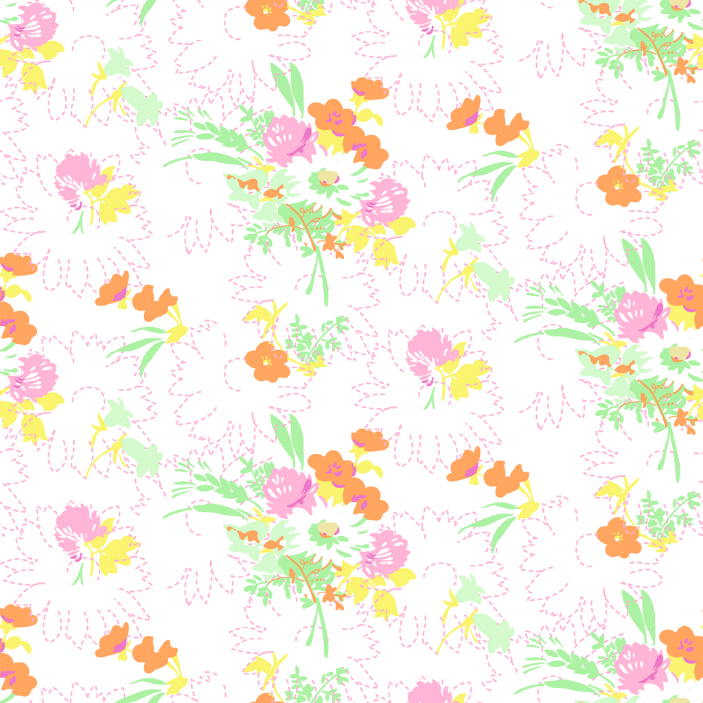 Delicate watercolor floral pattern featuring pink, orange, and yellow blooms with green foliage on a white background. Perfect for spring home decor or feminine apparel.