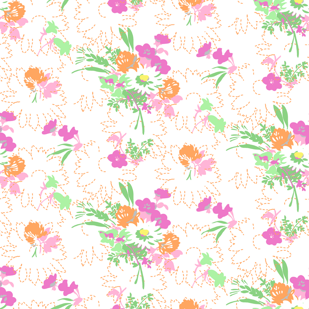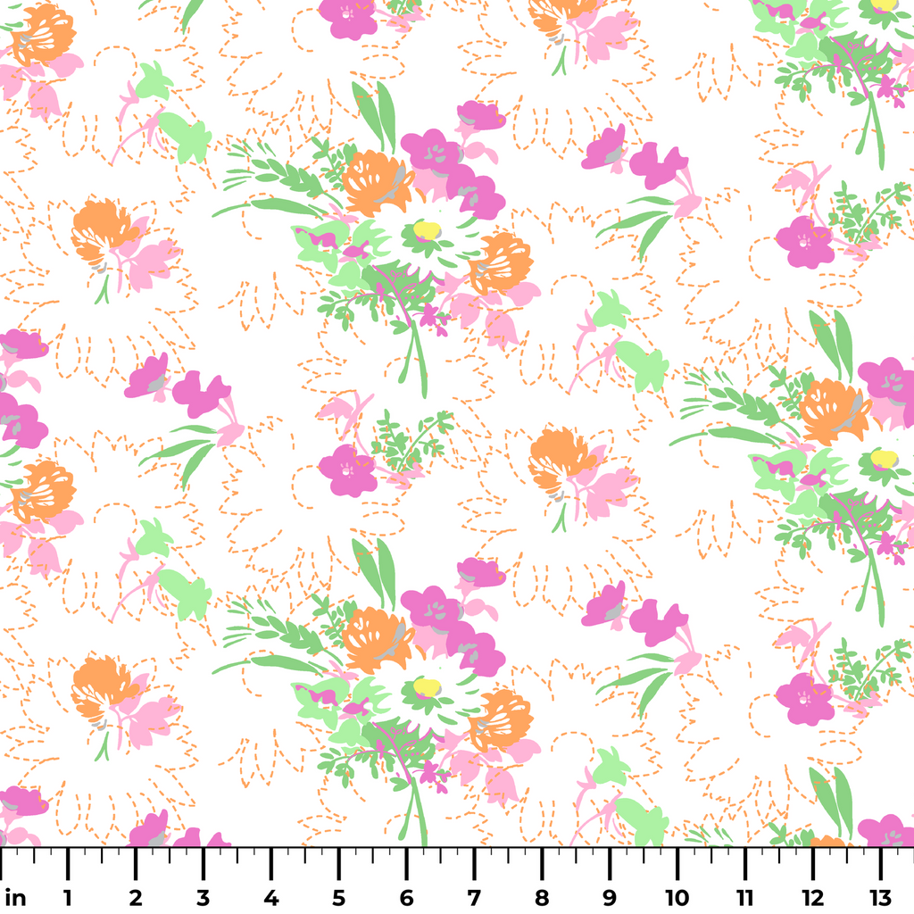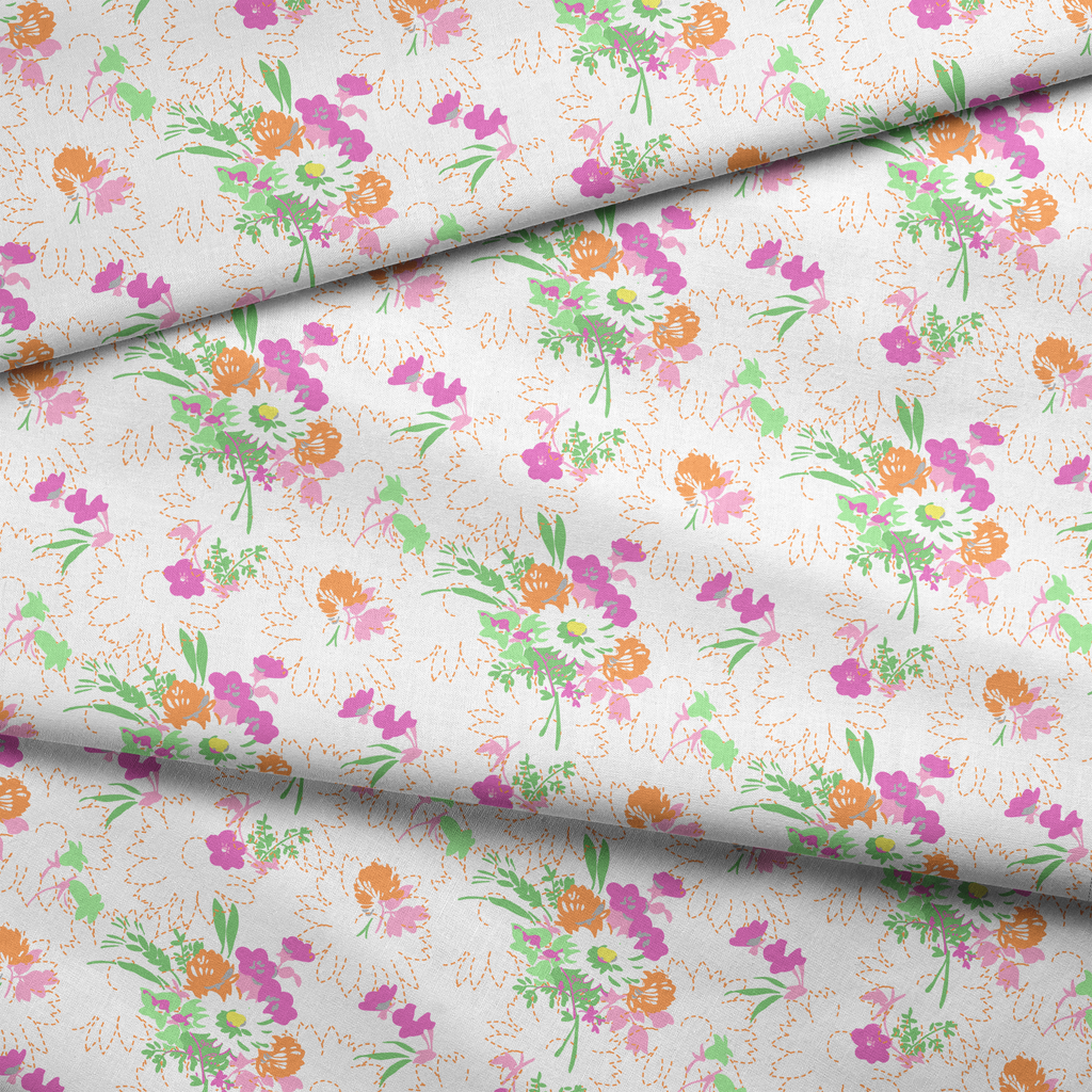 Vibrant floral pattern featuring daisies and mixed blooms in bright orange, pink, and purple with green foliage on a white background, creating a cheerful springtime aesthetic.