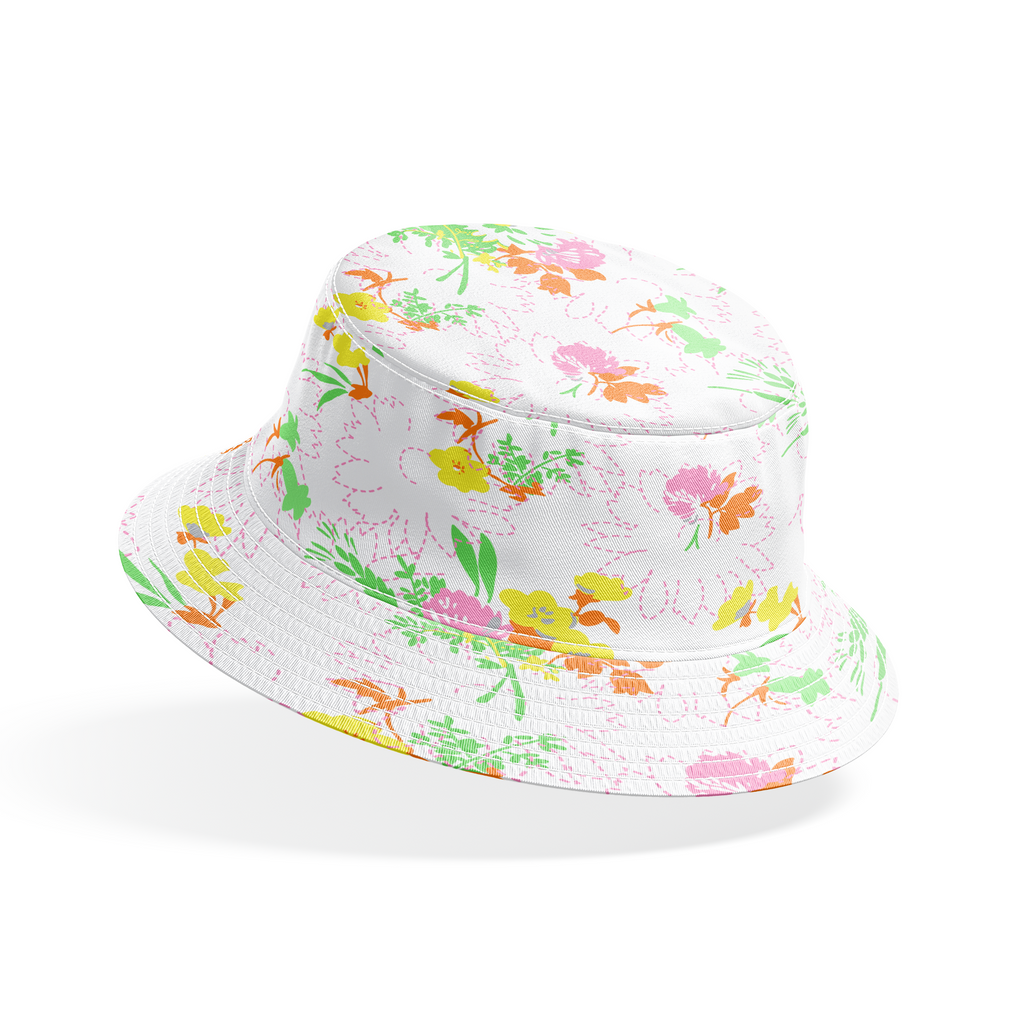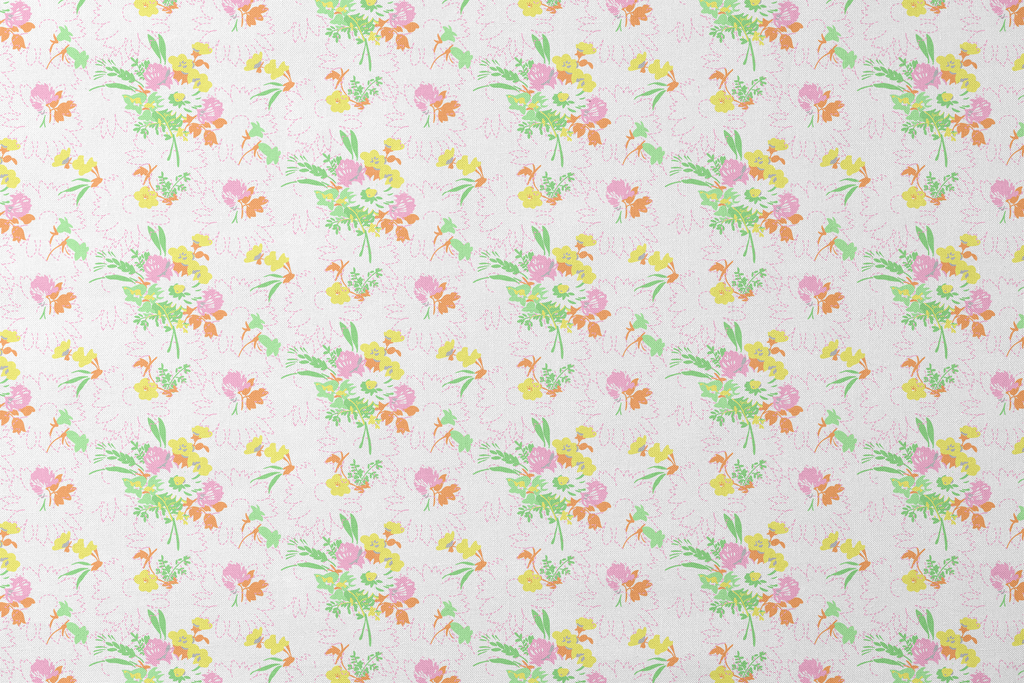 Vintage-inspired floral pattern with delicate blossoms in pastel pink, yellow, and orange on a white background. Perfect for spring apparel or home decor with its soft, romantic aesthetic.