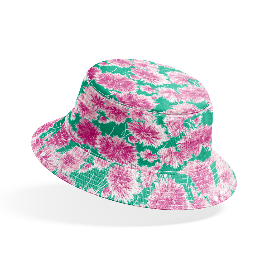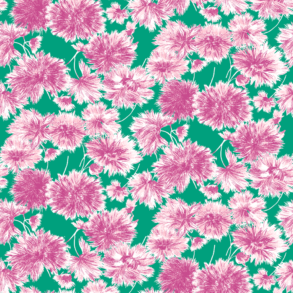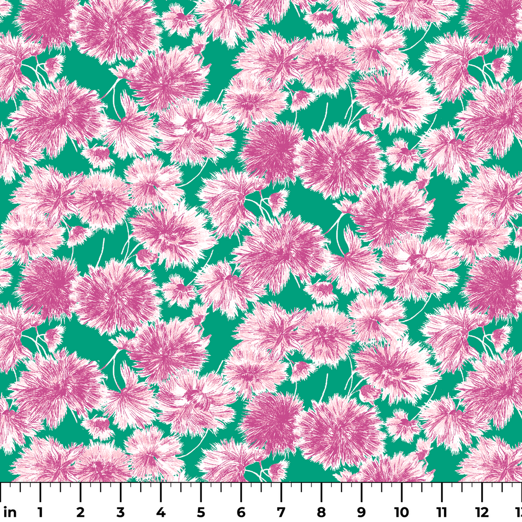 Vibrant pink dahlia blooms scattered across a rich teal green background create a striking floral pattern. Perfect for sewing contemporary home decor or apparel with its bold, artistic botanical design.
