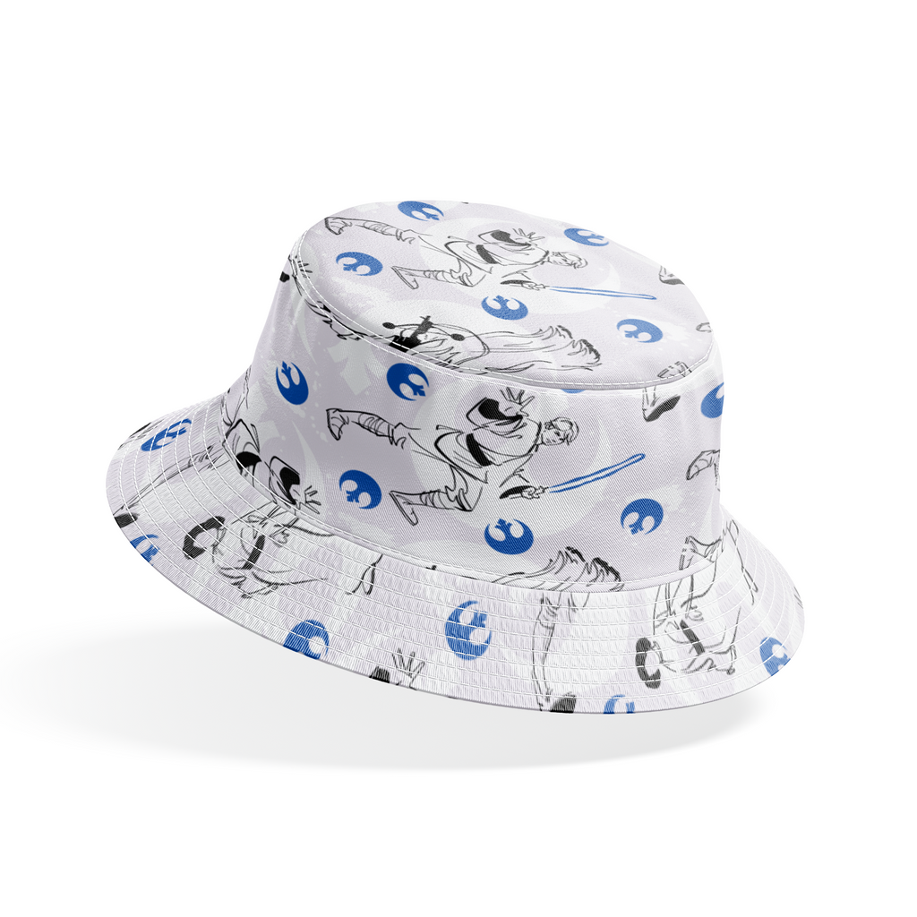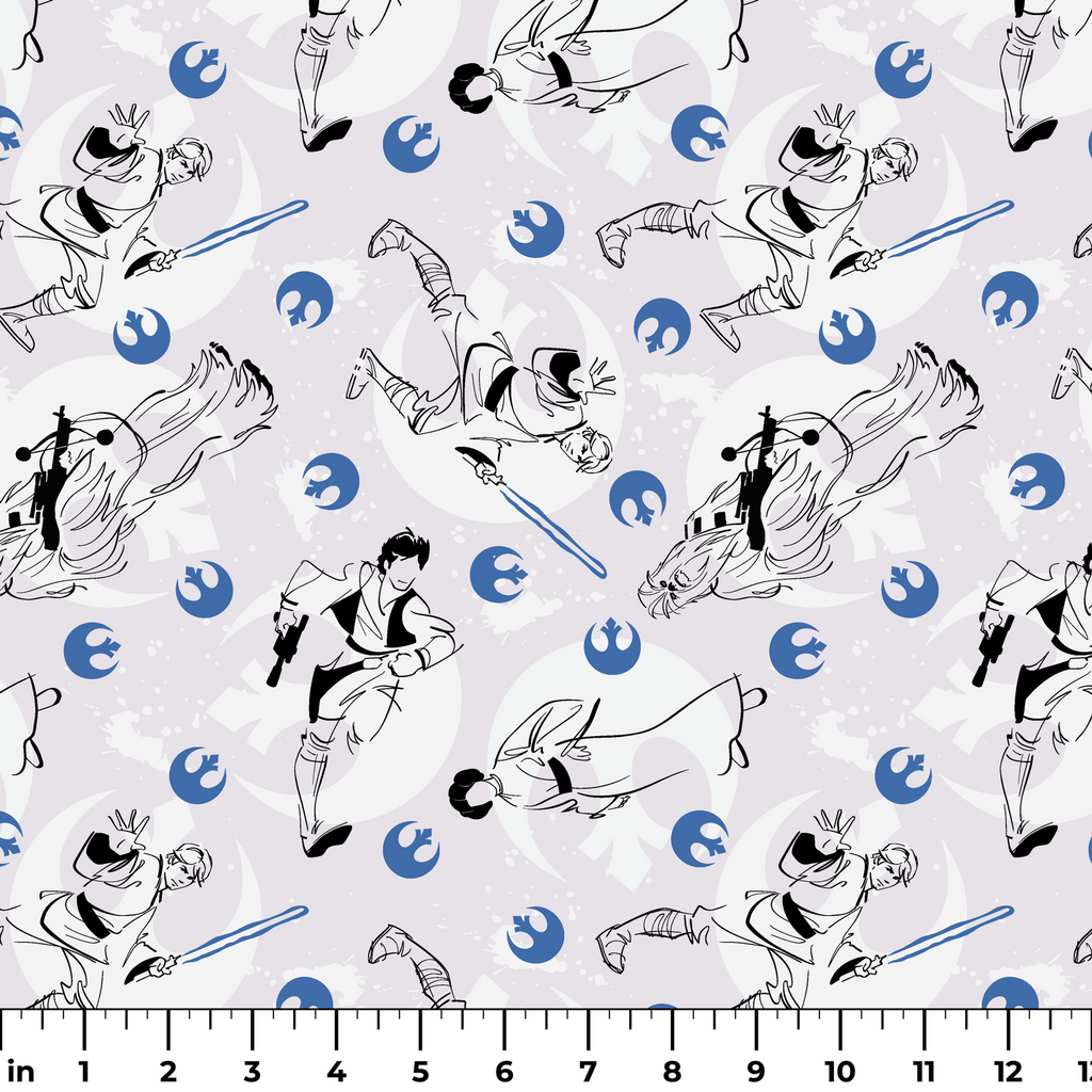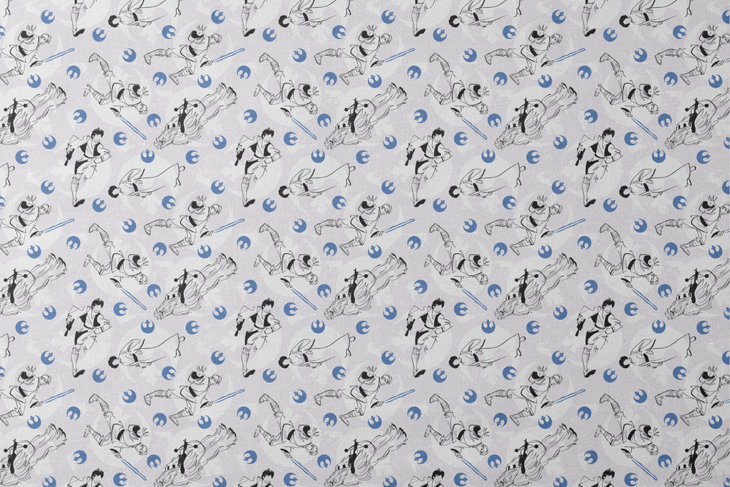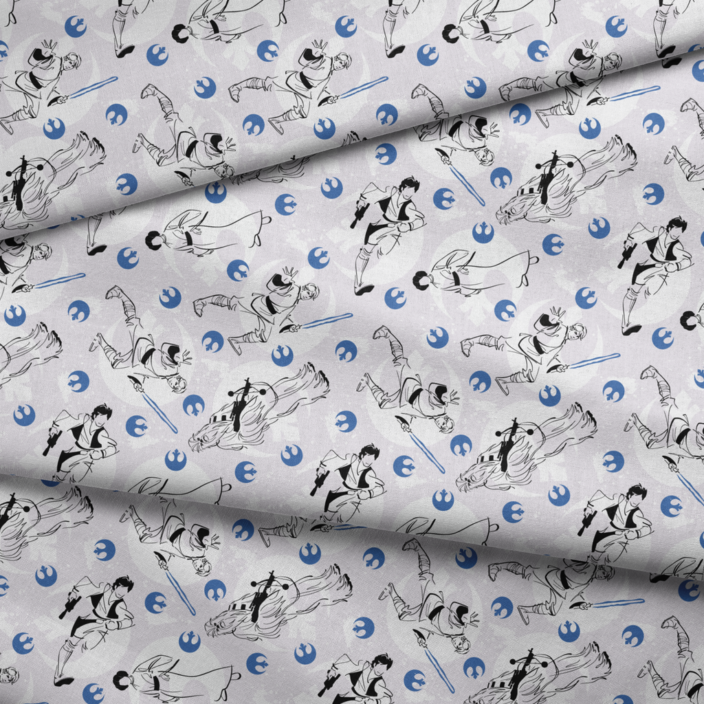 This STAR WARS inspired fabric features a repeating pattern of Rebel fighters with lightsabers and alliance symbols in a stylish blue and black sketch design - perfect for fans of the iconic sci-fi franchise.
