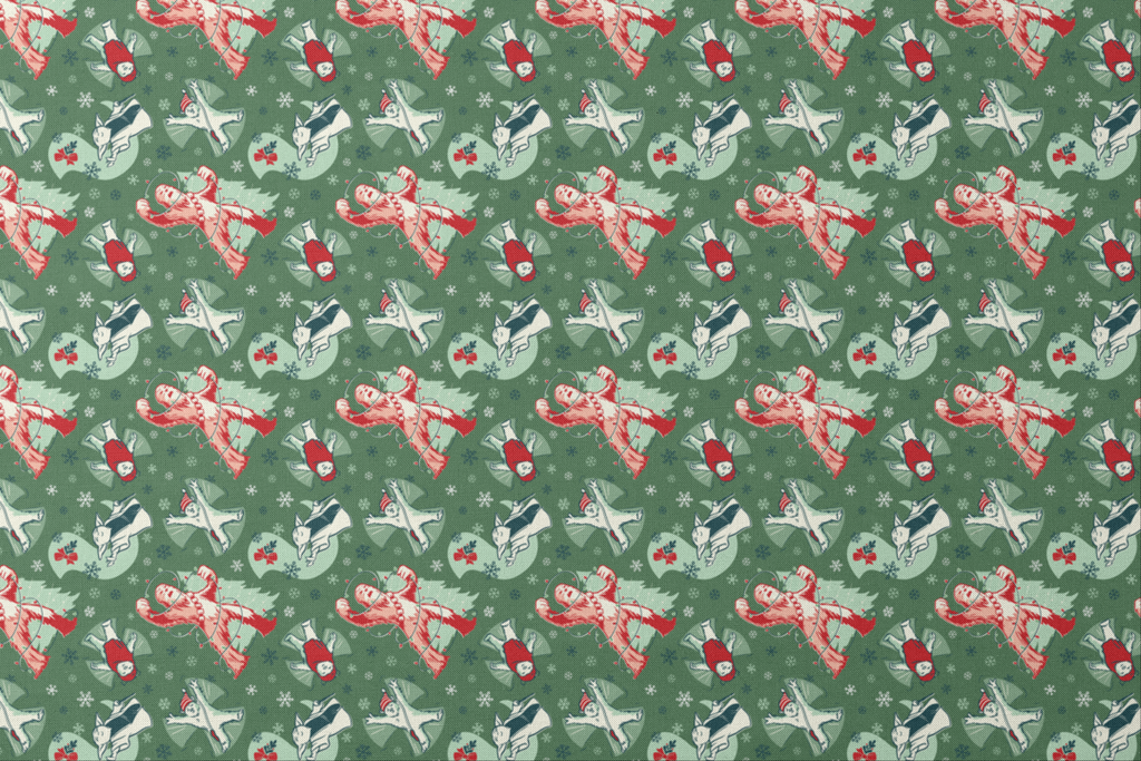 Festive STAR WARS inspired Christmas pattern featuring Ewok, Yoda and Chewbacca on a green background with delicate snowflake accents, perfect for holiday home decor.