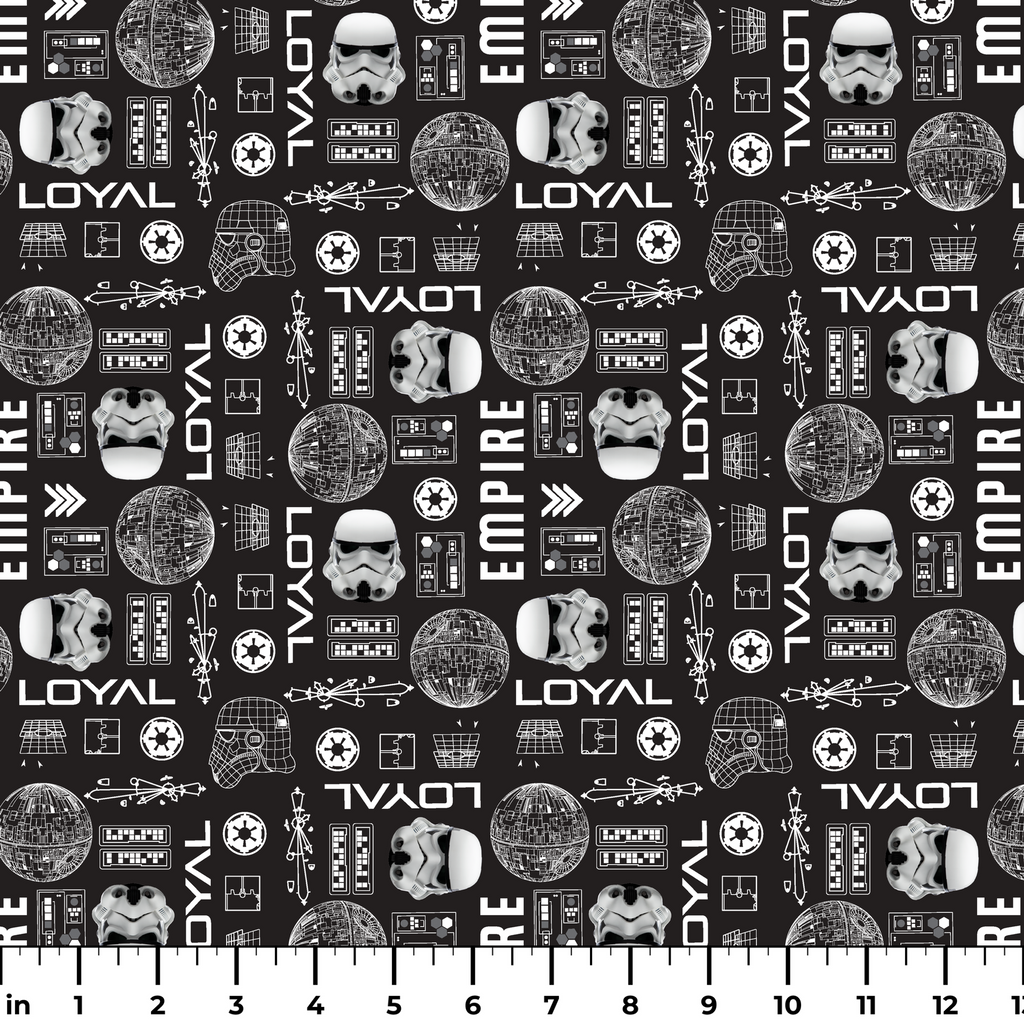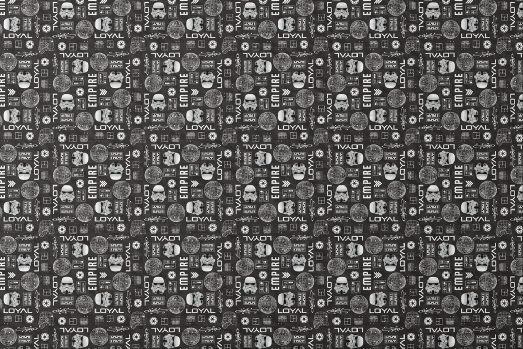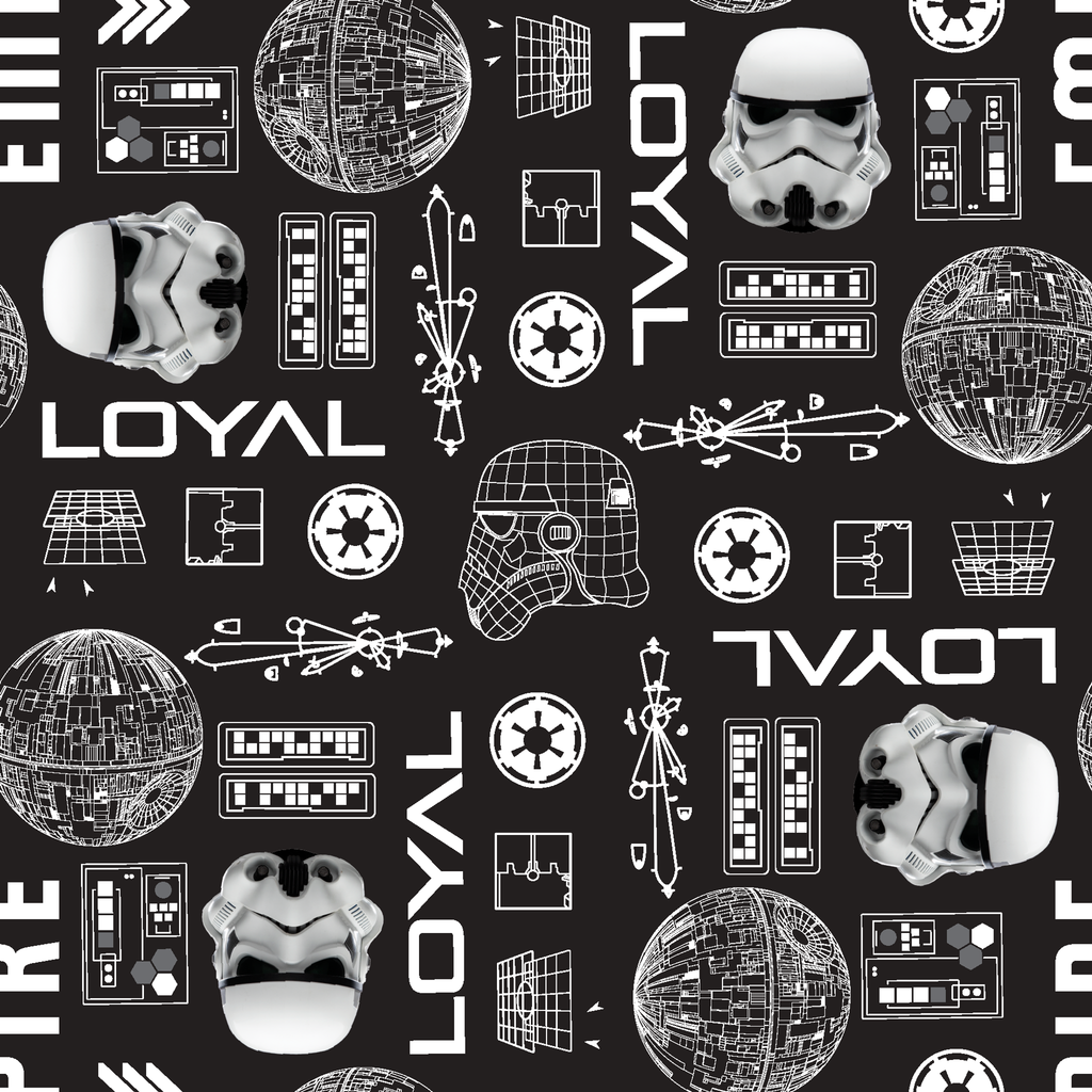 Iconic STAR WARS pattern featuring Death Stars, helmets and Imperial symbols on a sleek black background - perfect for fans of the galactic saga.