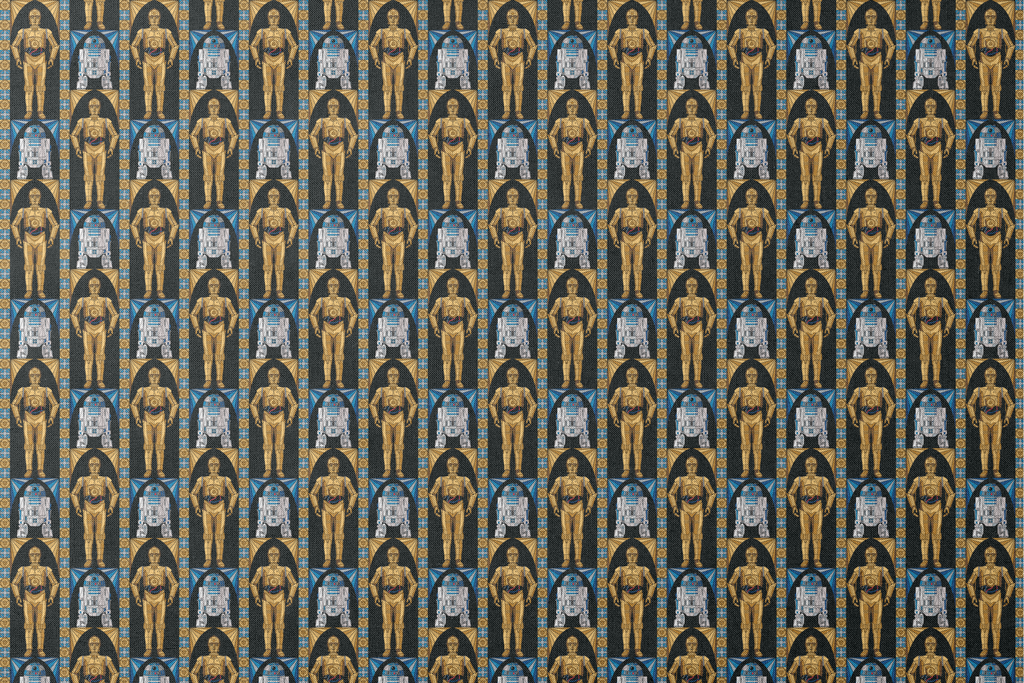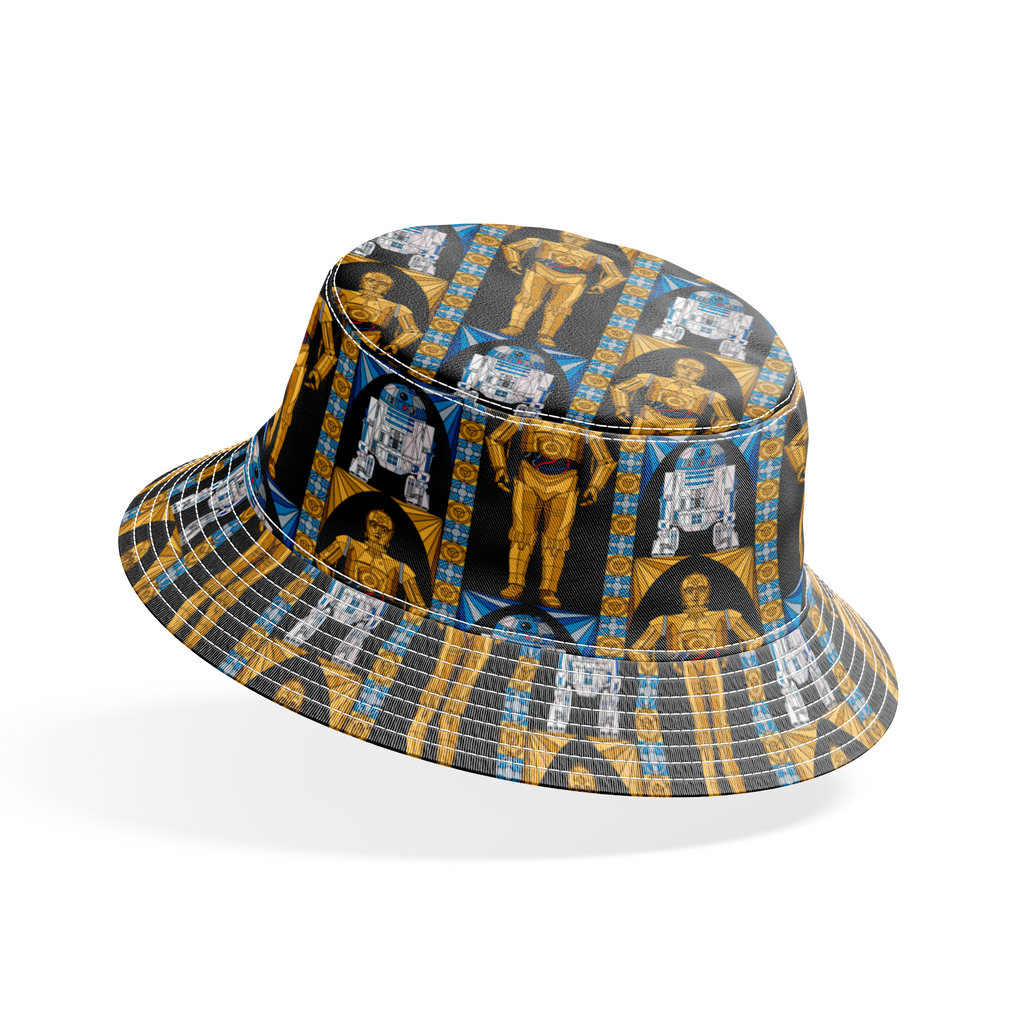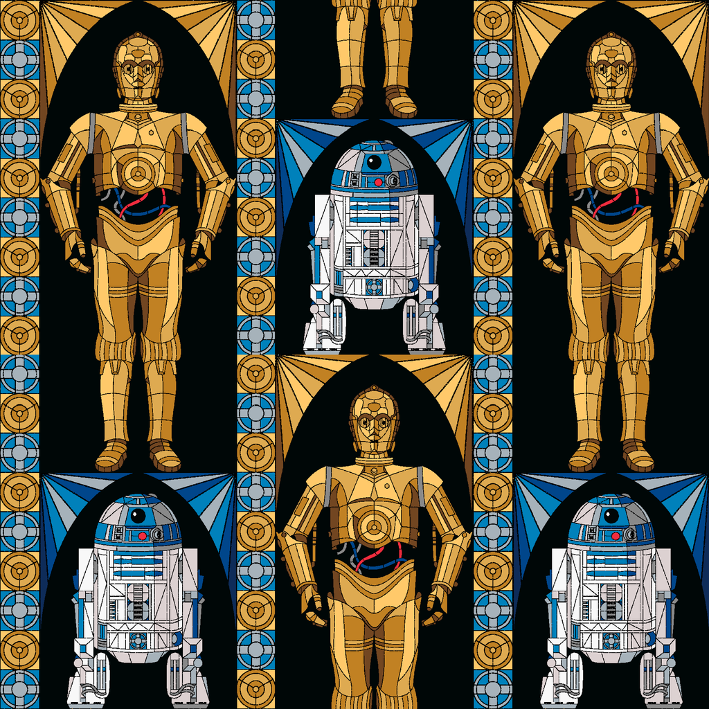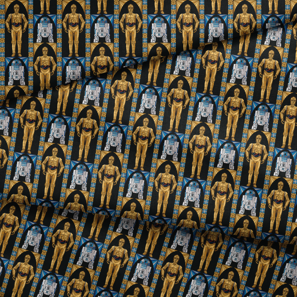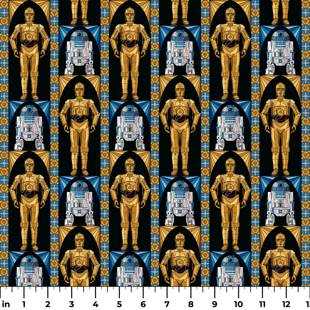 STAR WARS iconic droids in golden and blue hues on a black background with decorative borders. This retro sci-fi design features the protocol and astromech droids in a classic stained glass style.